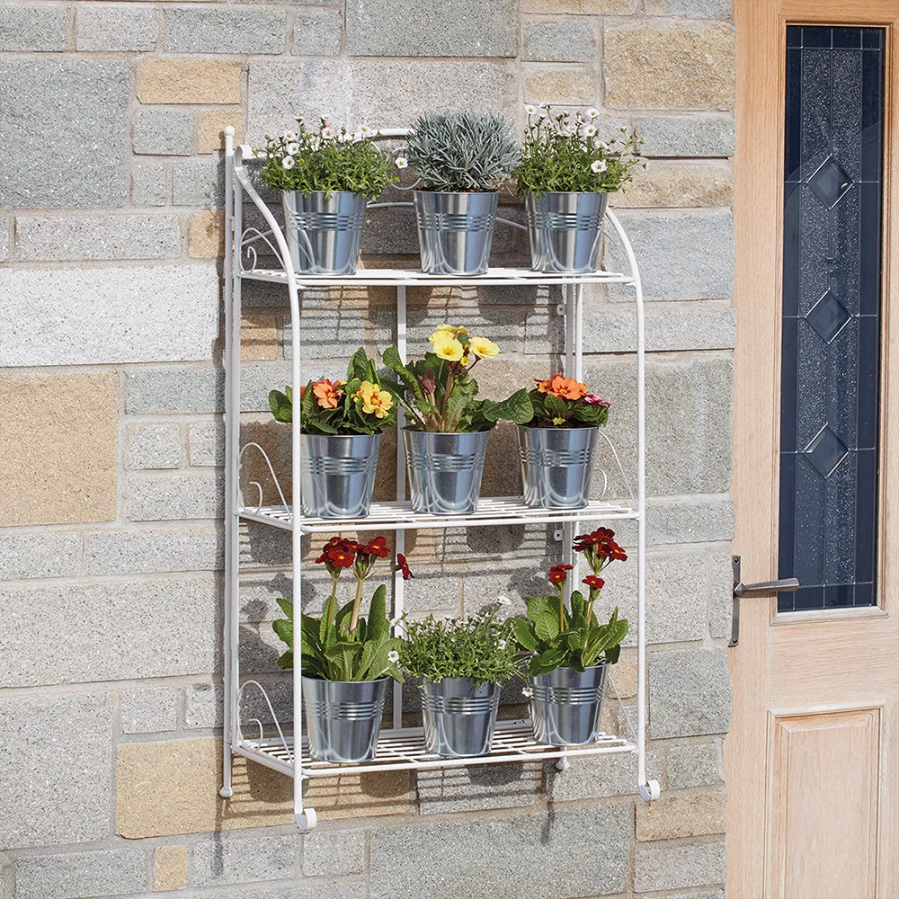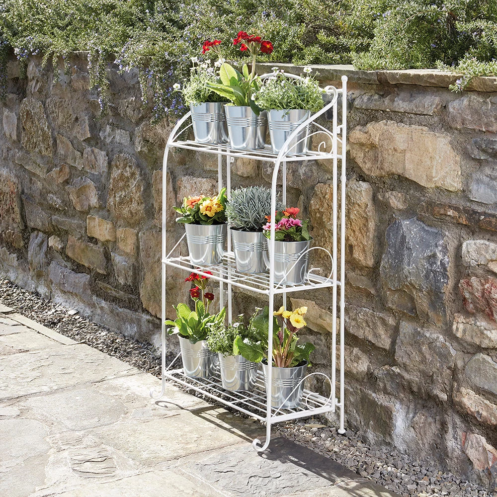 Display your plants in style with this three-tier folding metal plant stand from Garden Grow. Perfect for displaying plants, pots and a variety of other things, this stand features a spiral-pattered frame with wire shelving. Constructed from high-quality powder-coated steel for durability, the stand is weatherproof and is perfectly suited for use both indoors and outdoors.