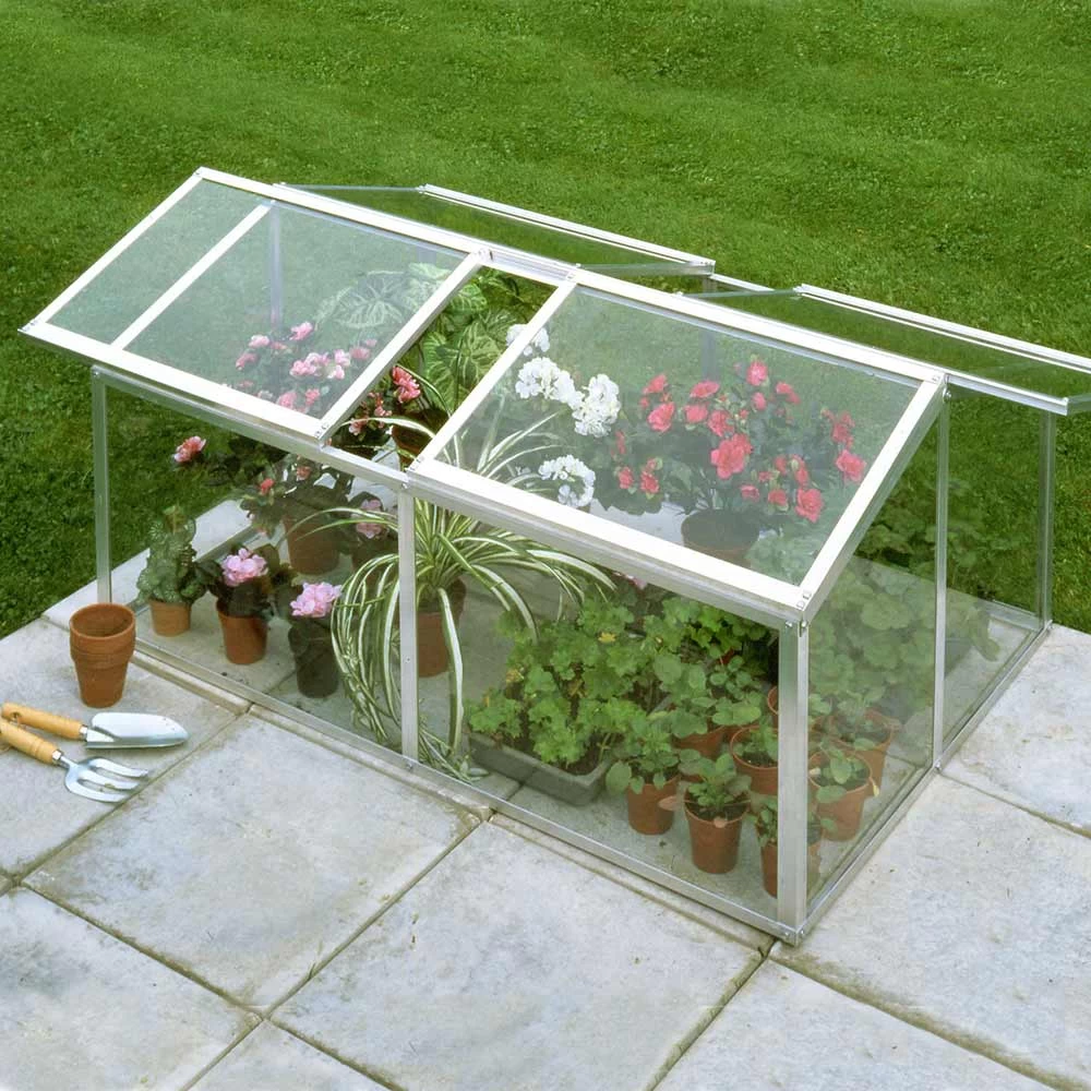 This sturdy aluminium cold frame is the perfect solution to extend your growing possibilities. Particularly invaluable in spring to raise young plants and ‘harden off’ tender items before planting out. It features toughened glass and comes with unique opening tops that can be raised like ordinary cold frames, but also slide left and right, allowing more precise temperature control! Size: 129cm length x 63cm width x 38cm high at the back point.