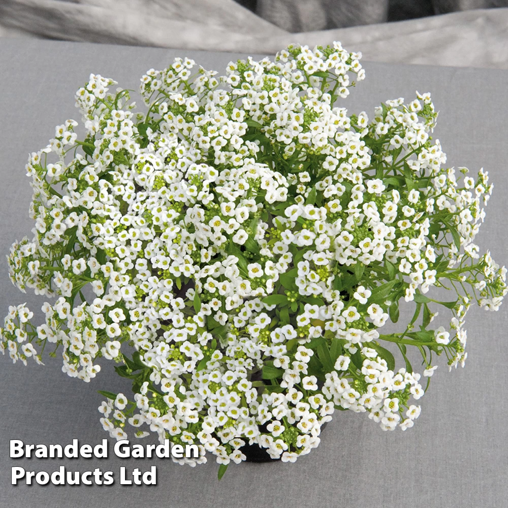 The largest flowered and tallest of all Alyssum varieties, ‘Giga White’ forms soft, pillowy mounds of pure white flowers that look wonderful billowing from a hanging basket or container either on their own or combined with other bedding. They are equally good as ground cover in borders and rockeries where their fragrant blooms will continue flowering from June until September, attracting masses of beneficial pollinators. Height: 15cm (6in). Spread: 30cm (12in).