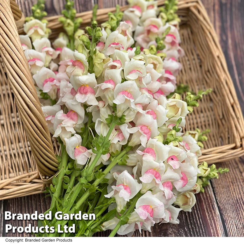 The Potomac series of snapdragons have been specially bred for tall, strong stems and excellent flower quality, making them ideal for cutting. Antirrhinum ‘Potomac Appleblossom’ produces sturdy spires of bi-coloured, pink and white flowers which make a strong vertical statement in borders, flowering over a long period from late spring throughout summer. Maximum height: 150cm (60”). Maximum spread: 30cm (12”).