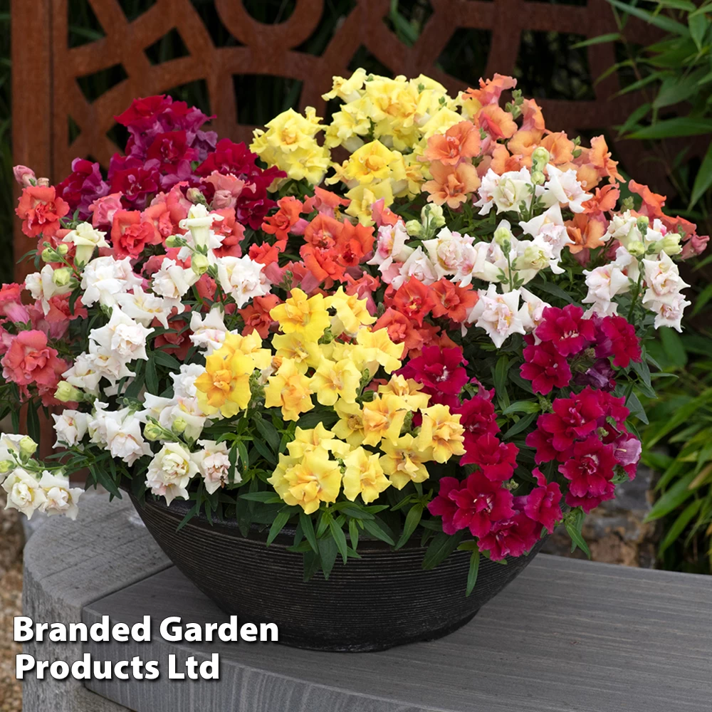 Up the ante with this new Antirrhinum! ‘Sweet Duet’ boasts improved doubleness and flower size compared to other varieties, along with intense fragrance. All of this is delivered in a delicious palette of colours – from fruity salmon and peach to deep red and apple blossom pink. Plants are vigorous, forming a strong, branching base before flowering, which means an abundance of weather-proof blooms. Perfect for use at the front of borders, in patio containers where you can readily enjoy their scent, or as fragrant cut flowers for indoors. Height 40cm (15in). Spread 35cm (14in).