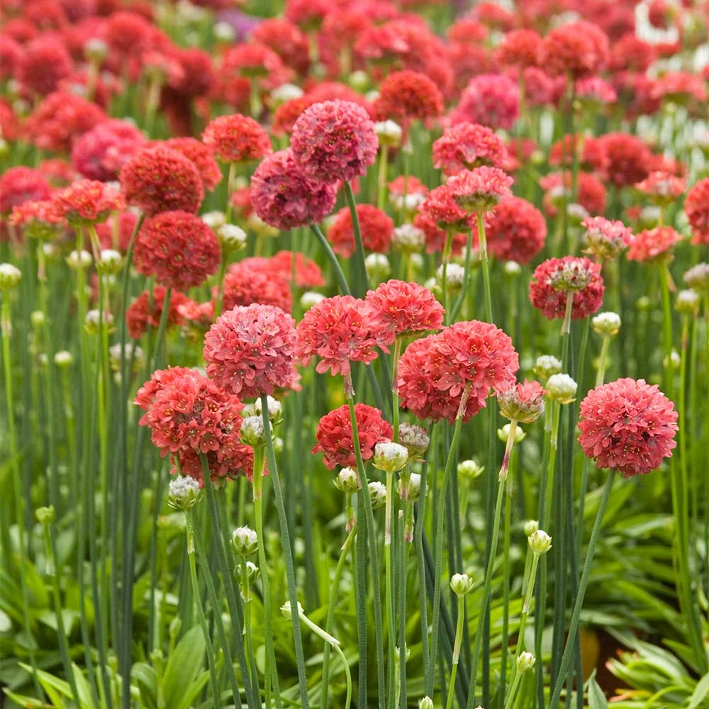 Compact and uniform plants with grass-like foliage, and strong stems topped with globe-shaped red blooms. Very free-flowering, first year blooming, and excellent in rock gardens. Flowers late May-early October. Height 20-30cm (8-12″); spread 20-30cm (8-12″).
