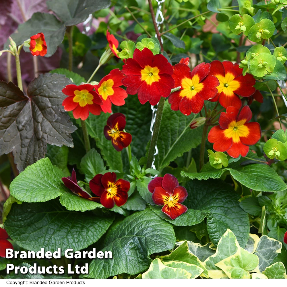 - Primula ‘Inara Scarlet’ – Fiery red flowers with yellow centres in early spring. Height and spread: 30cm (12in).
