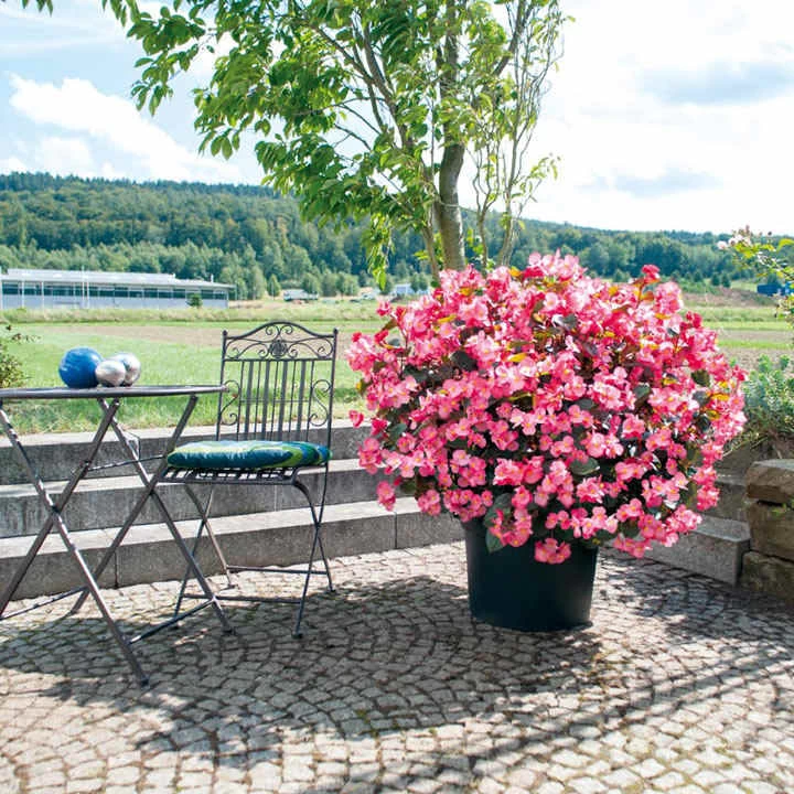 Producing a plant with large flowers and a vigorous growth habit – in a warm summer plants can reach a height of 85cm and spread of 60cm! The giant, bushy plants will be smothered in rose-coloured flowers, set off to perfection against the dramatic bronze foliage, all summer long. Perfect for filling large borders economically, or to create an-eye-catching specimen in a container; or why not plant them in a long row to create the most amazing hedge! The plants will thrive in sun or shade and are low maintainance and “self cleaning”, so you don’t even need to worry about dead heading! Improved variety. Flowers May-September. Height 85cm (34″).