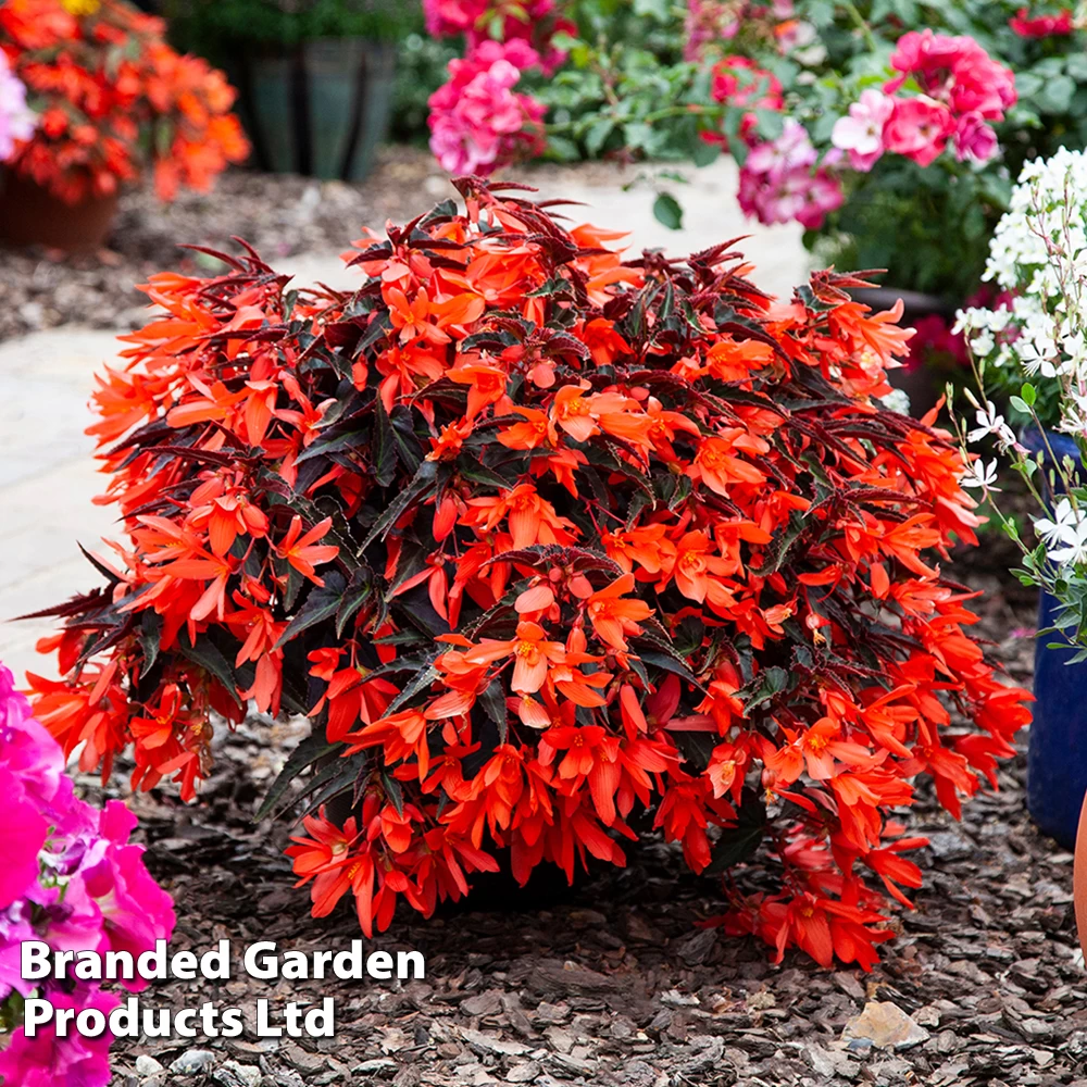 Begonia Bossa Nova Night Fever produces an abundance of blooms from July until November, that is vibrantly orange and hard to miss! The dark grey-green foliage is a gorgeous backdrop to the fiery tones and it looks beautiful in a patio pot.