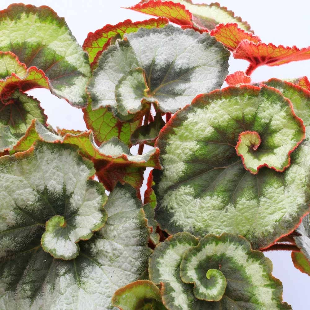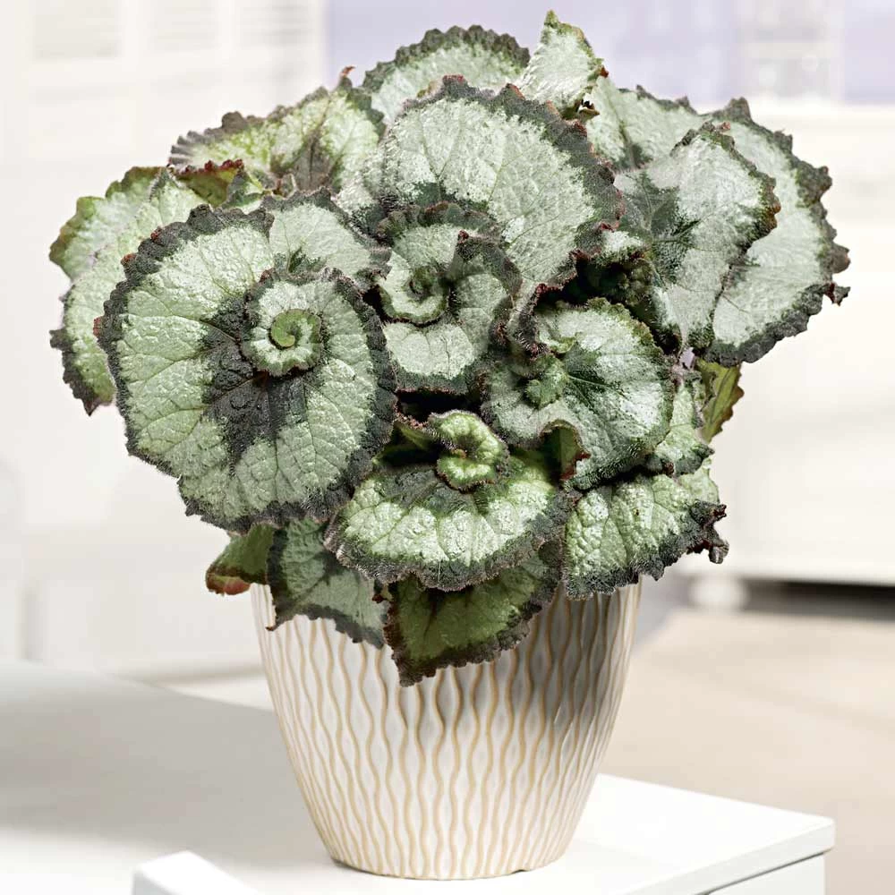 One of the most beautiful begonias for inside the home. A large leaf with swirls of olive green and silver. Leaves up to 30cm long with hairy stems. Rex type. Flowers January-December. Height 41-50cm. TP – Tender perennial.