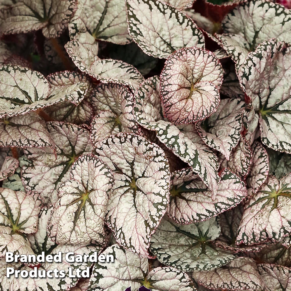 A stunning compact begonia. The silver leaves shimmer in the light with the dark edging producing a delicate pattern. The dark red underneath the leaf shows through the leaf veins. Rex type. Flowers January-December. Height 21-30cm. TP – Tender perennial.
