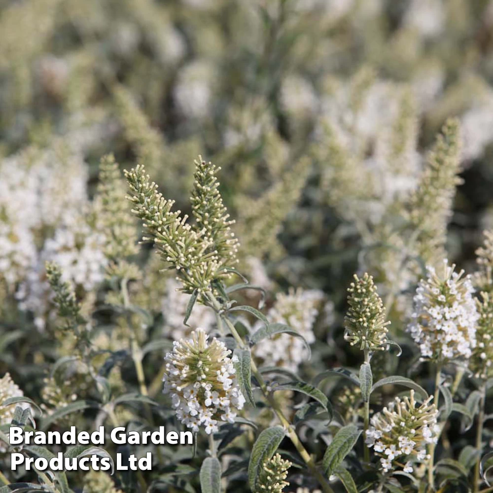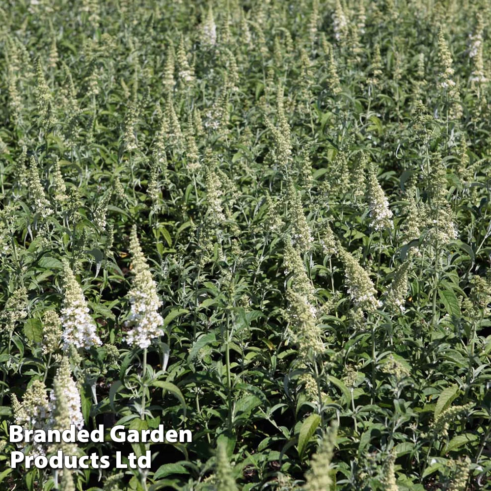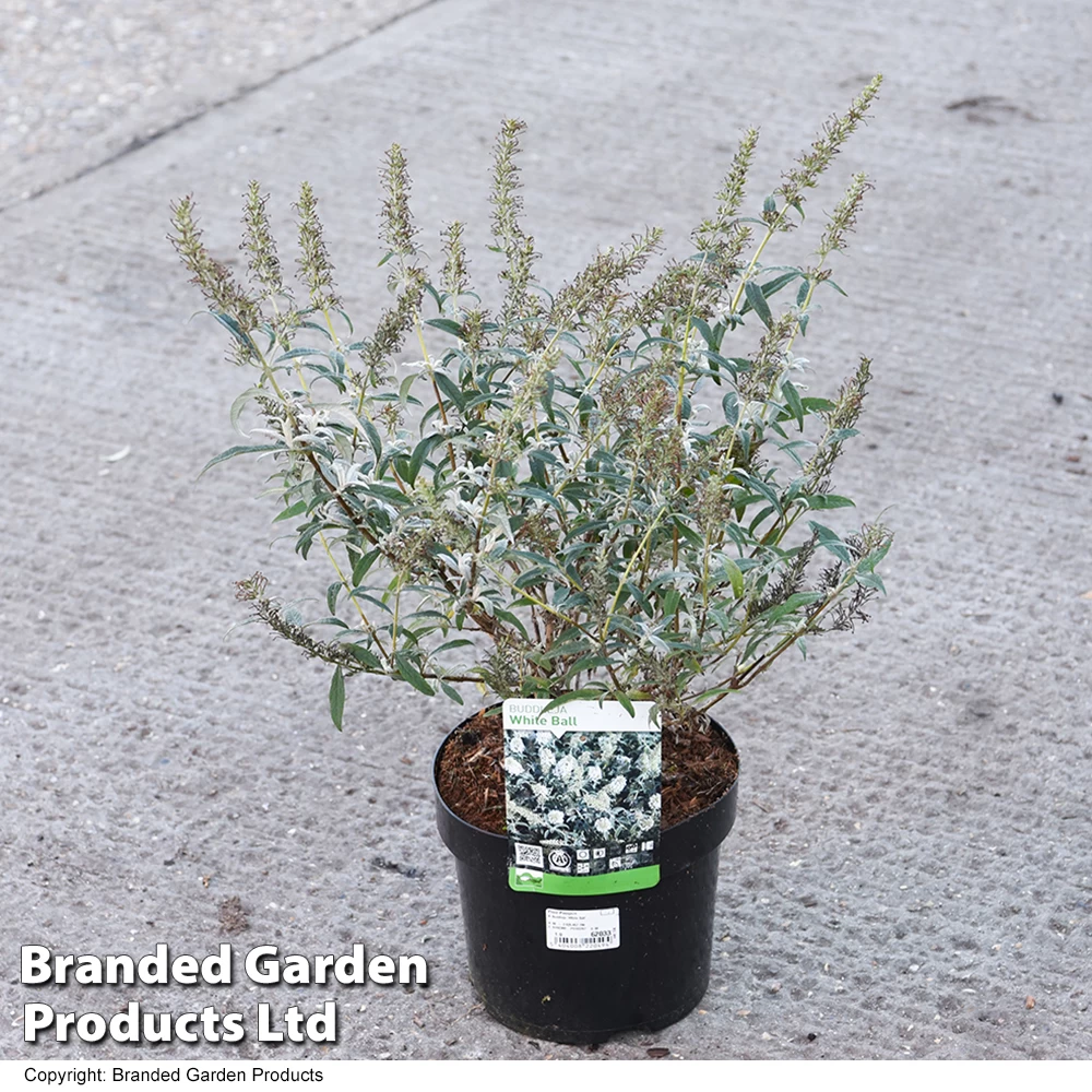 Buddleja davidii ‘White Ball’ produces large crests of miniature white flowers on curved stems from July to September. This scented variety attracts a mass of butterflies to your garden thanks to its nectar rich blooms. This hardy shrub is perfect for large patio containers or at the back of borders. Height and Spread: 200cm (79″). Plant Buddleja into garden borders in any moist, well-drained garden soil, in full sun or semi-shade. Alternatively grow Butterfly Bush plants in patio containers using soil based compost such as John Innes No.3.