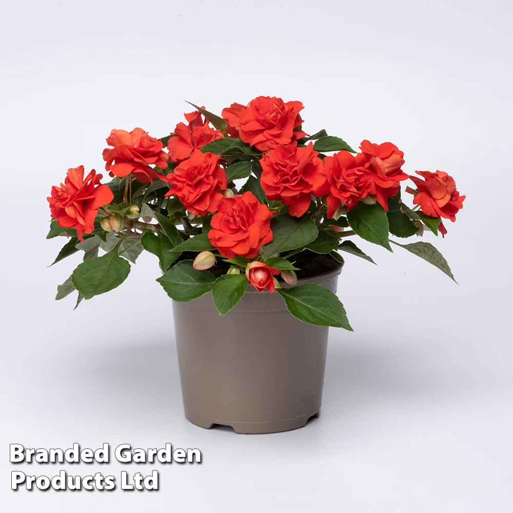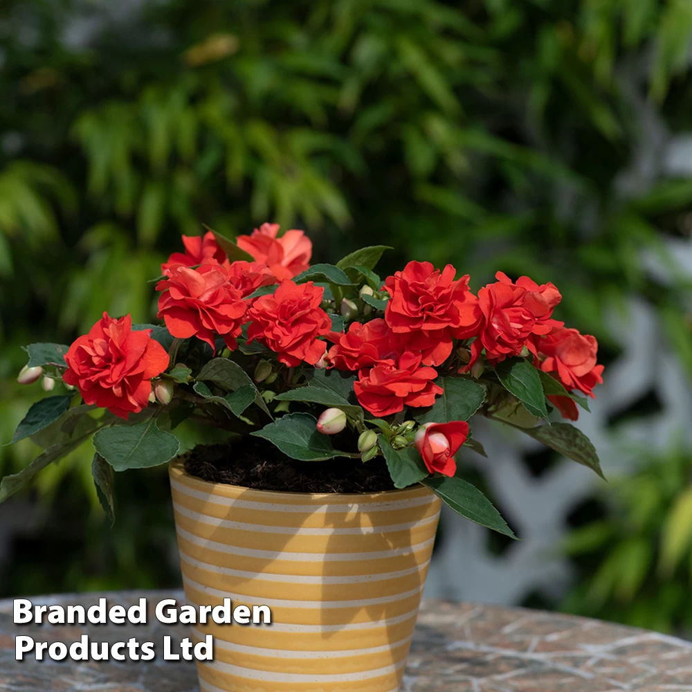 A double variety which is highly resistant to mildew as well as being exceptionally pretty! One of the award-winning Glimmer™ series, Busy Lizzie ‘Glimmer Bright Red’ forms neat, bushy mounds of foliage smothered in double flowers in a romantic shade of bold red. Each exquisite flower resembles a miniature rose. Plant Busy Lizzie ‘Glimmer Bright Red’ in containers, baskets and window boxes where from May to September its rich colour will illuminate shady spots. Height: 40cm (16in). Spread: 30cm (12in).