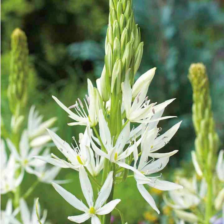 Tall spires, creamy white, star-shaped flowers and dark strap-like leaves. Flowers May-June. Height 1-1.5m.