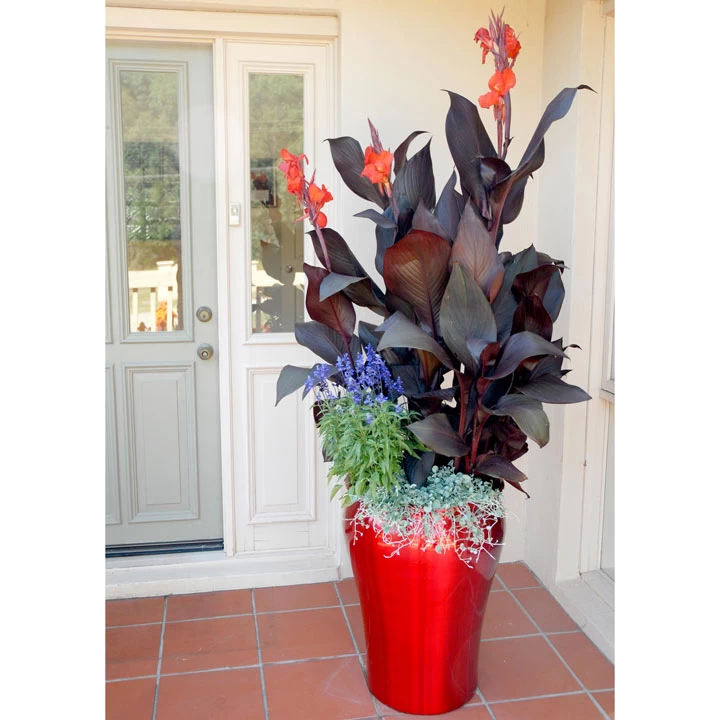 The Canna Plant – Tropicanna Black is a truly spectacular plant. Adding dark contrasts to your flower beds and borders. The foliage of this plant is dark in colour, complemented by bright and vibrant orange flowers. These flowers will really stand out in flower beds around your garden. For a spectacular flower display, plant the Canna Plant – Tropicanna Black in a decorative container or patio pot to create fantastic talking points around your patio.