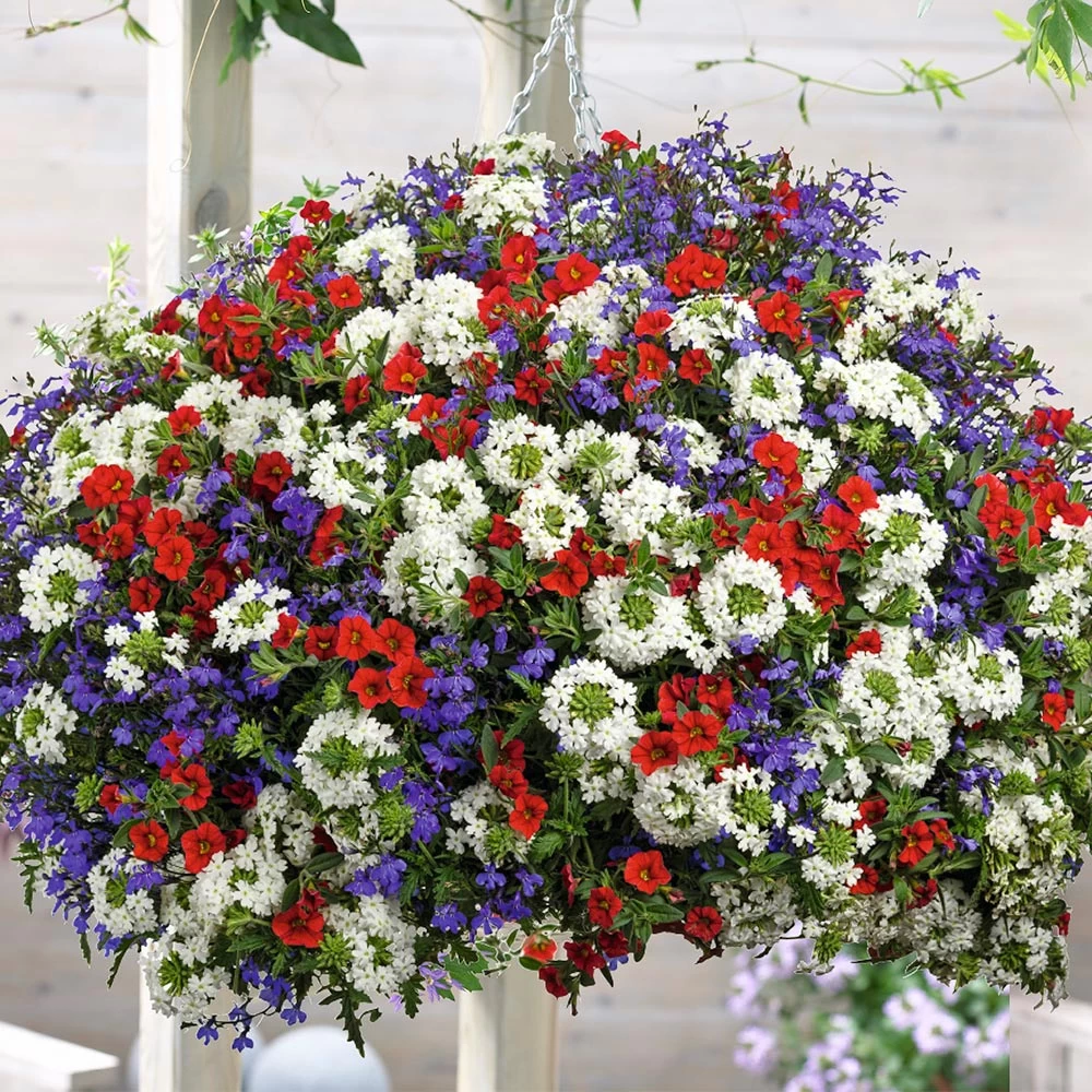 Comprises three first-class varieties – Calibrachoa Red, Lobelia Blue and Verbena White, which will put on a spectacular summer-long display in baskets or containers.