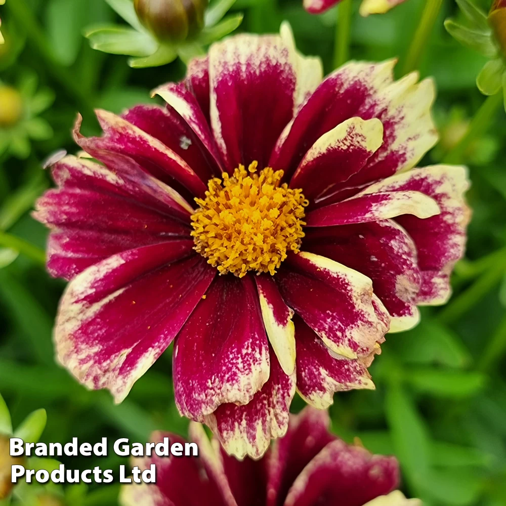 Big, bee-friendly flowers that go on blooming for weeks! Coreopsis ‘Solar Fancy’ bears masses of cherry-red flowers with pale yellow margins.
