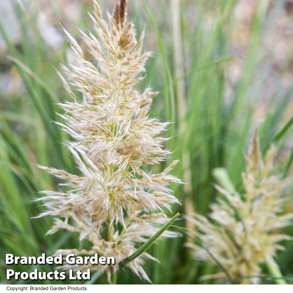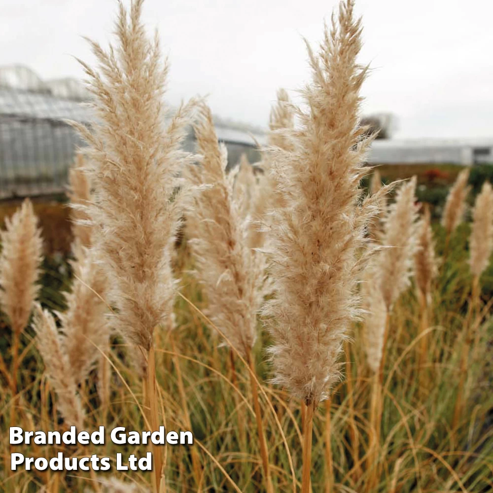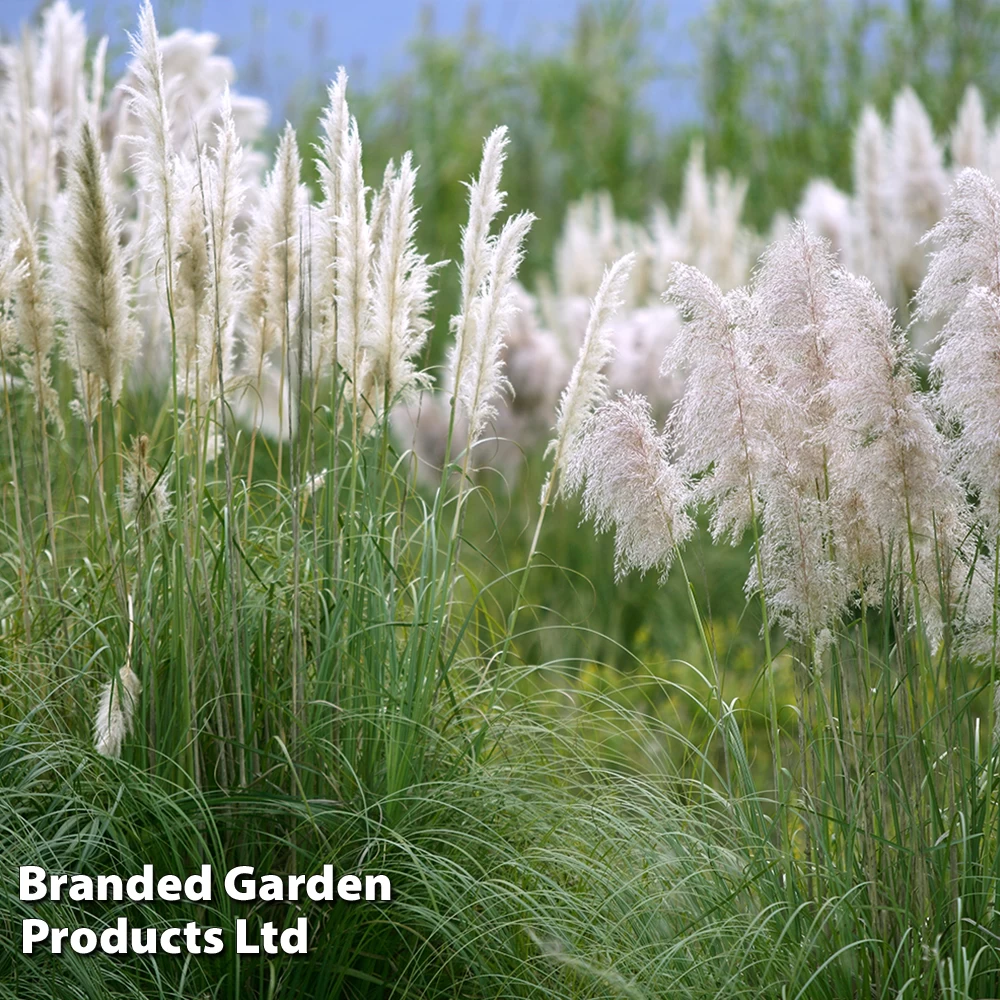 Much more dwarf and compact than other pampas grass varieties but needs similar growing conditions. Fully hardy perennial evergreen plant producing a tussock of stiff, flat, narrowly linear green leaves with white flowers from August to October. Plant Pampas Grass into garden borders in a fertile, well-drained garden soil, in full sun. During their first winter, protect the crown of newly-planted specimens.