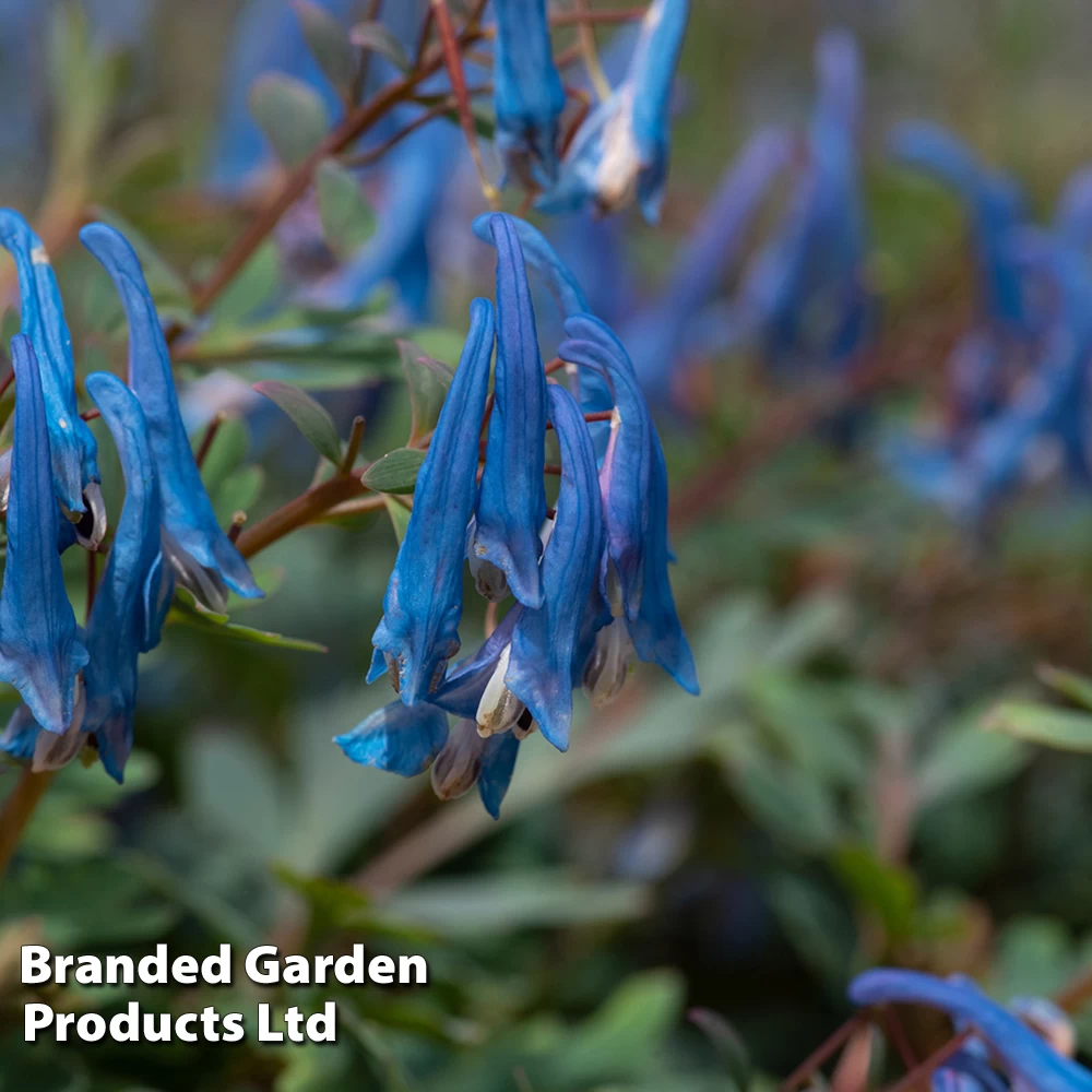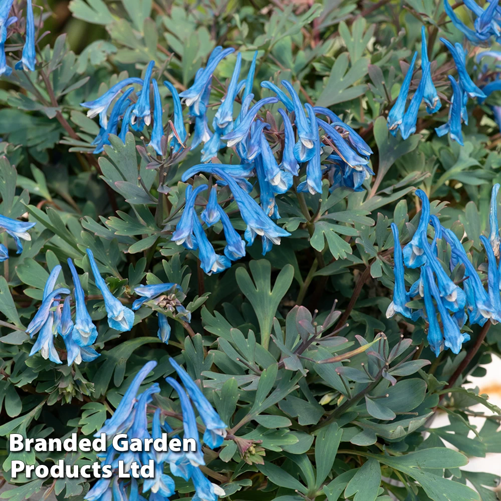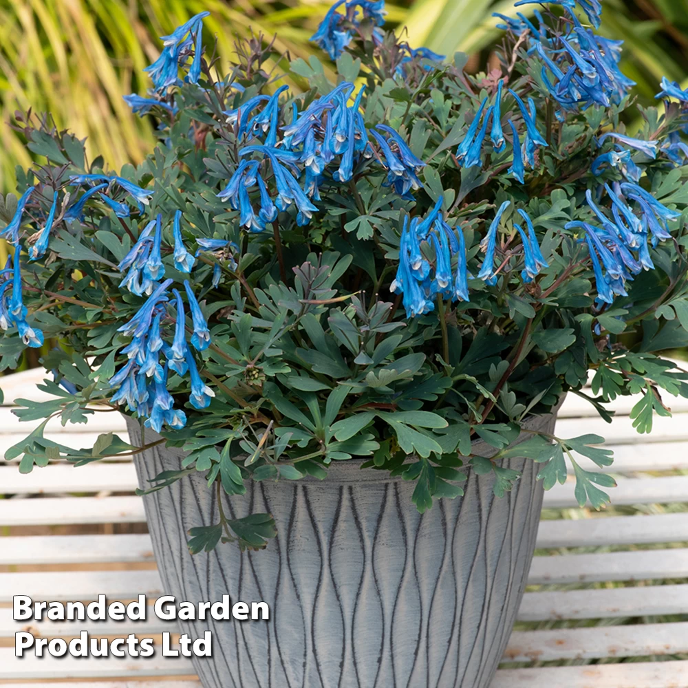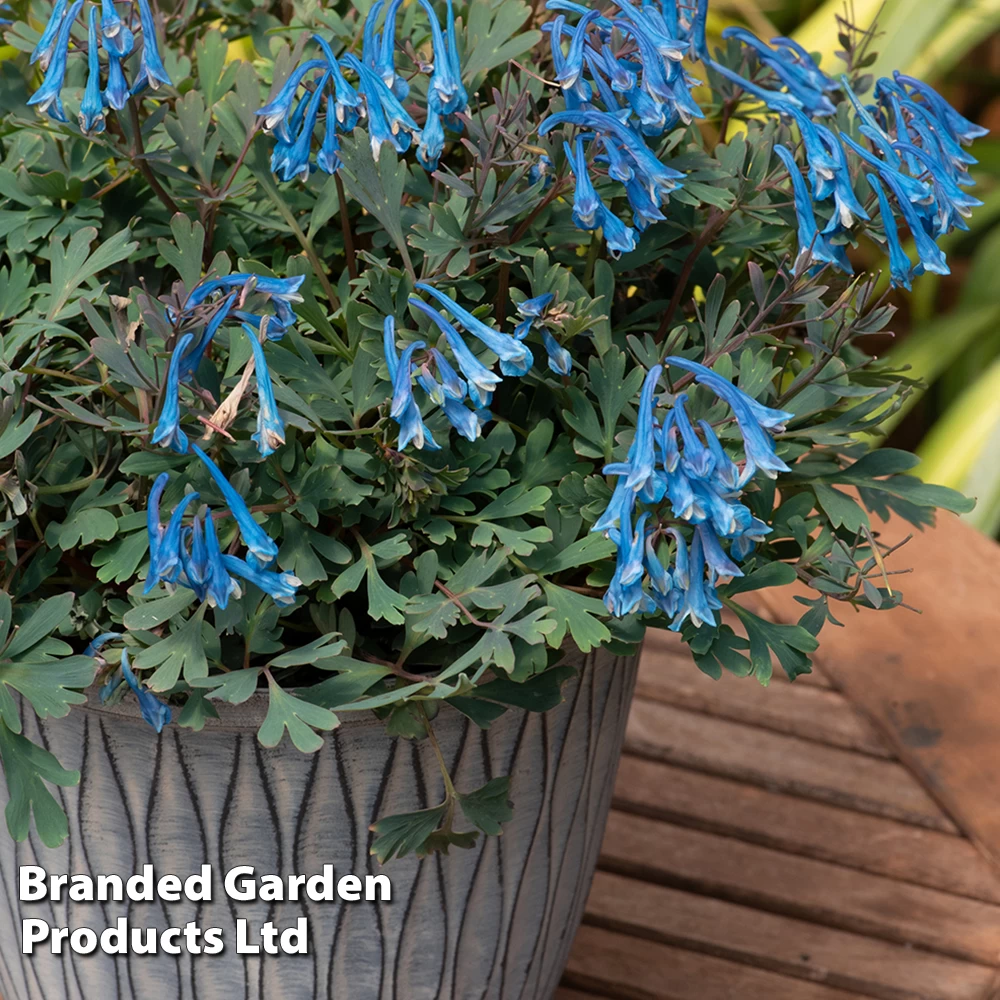 An excellent variety boasting intense gentian blue flowers with an extended flowering season. Pot up Corydalis plants into larger pots and grow them on in frost free conditions until they are well grown. Gradually acclimatise them to outdoor conditions over 7 to 10 days before transplanting into borders and containers. Grow Corydalis in fertile, humus-rich, well drained soil in a sunny position or in dappled shade. Improve soil conditions by adding plenty of well-rotted manure or garden compost prior to planting.