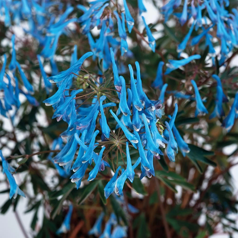 Exceptional blue flowers sit upon soft stems above a spreading clump of finely cut, blue-green foliage. The slender, tubular flowers of Porcelain Blue emerge in spring, with a second flush of flower heads in autumn.