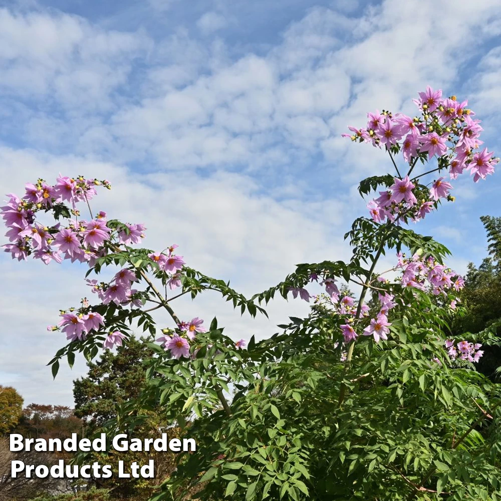 This enormous wild species dahlia can reach up to three metres in a single growing season. Plant Dahlia tubers outdoors in April after all risk of frost has passed. Choose a sunny position in moist well drained soil. Prepare the soil by digging in plenty of well rotted manure or compost. Plant tubers at a depth of 15cm (6″) and water well. Alternatively, start tubers into growth in pots of compost in a frost free greenhouse. Transplant them into their final positions outdoors in June.