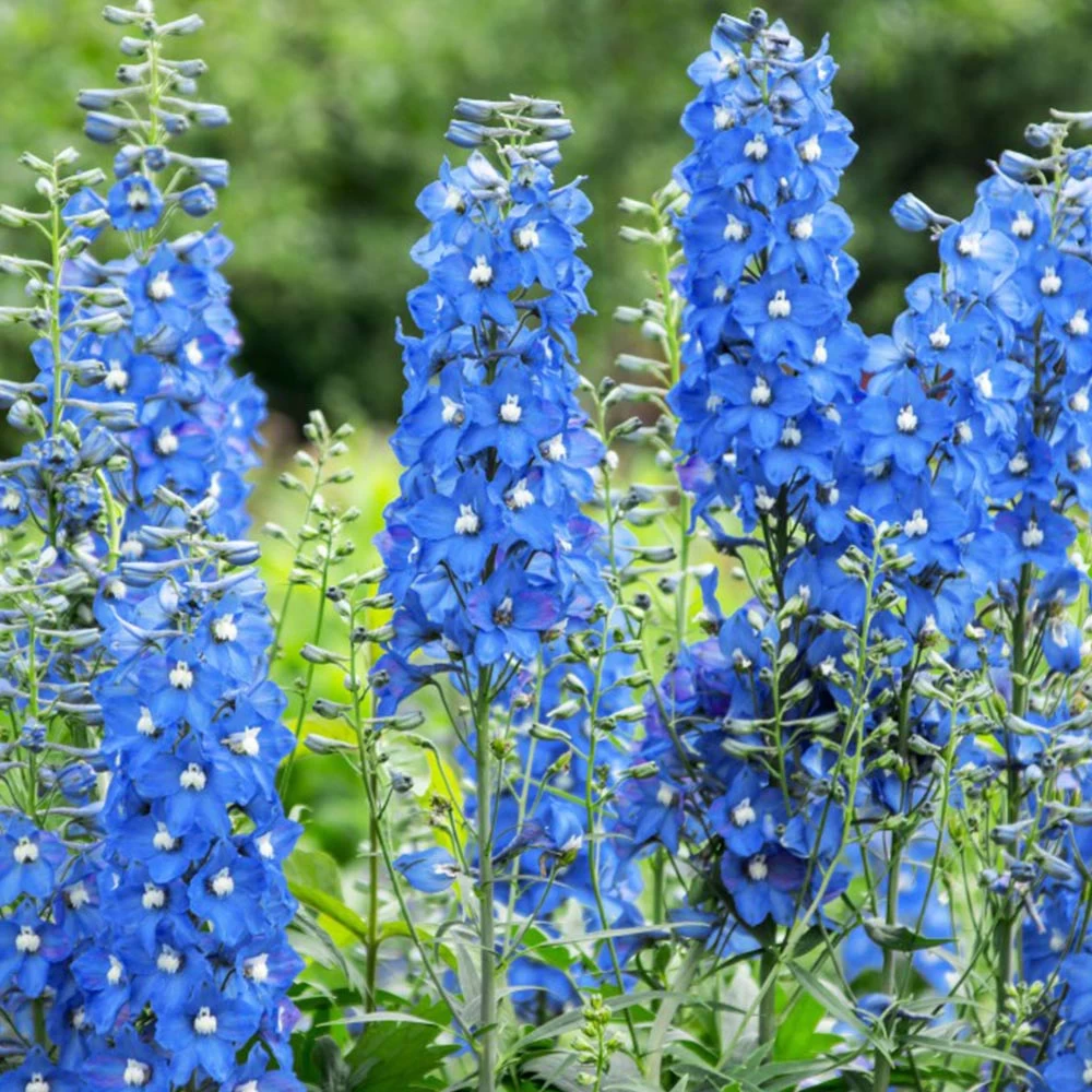 Amazing spikes of powder-blue flowers with a white eye, creates plenty of interest in borders from June to July.