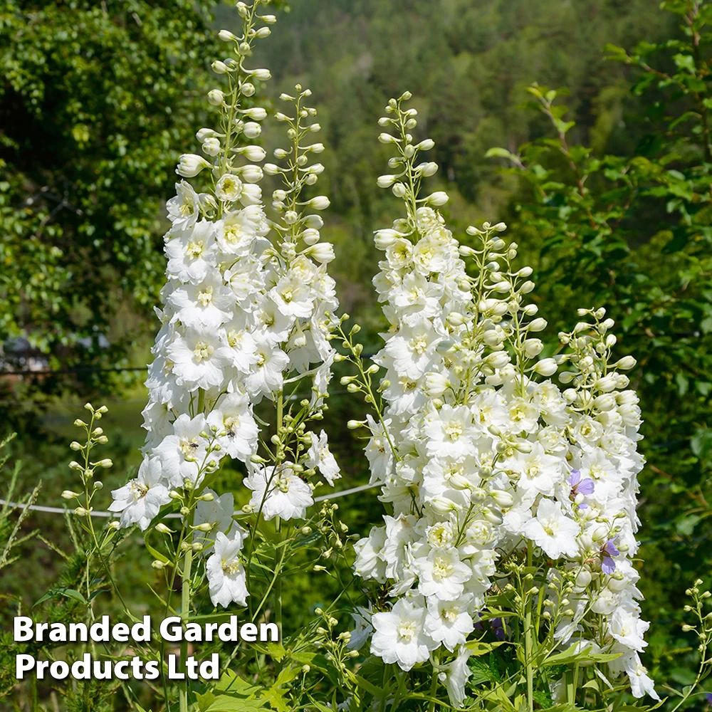This dwarf delphinium creates an airy cloud of delicate white blooms held on loose, freely-branching stems. Delphinium ‘White Swan’ is the perfect choice for smaller gardens, its luminous blooms gliding along the front of sunny borders. Height: 20cm (8in) 50cm (20in). This dwarf delphinium creates an airy cloud of delicate white blooms held on loose, freely-branching stems. Choose a sunny position that is sheltered from strong winds, on moist, well drained soil. Protect young delphiniums from slugs and snails.