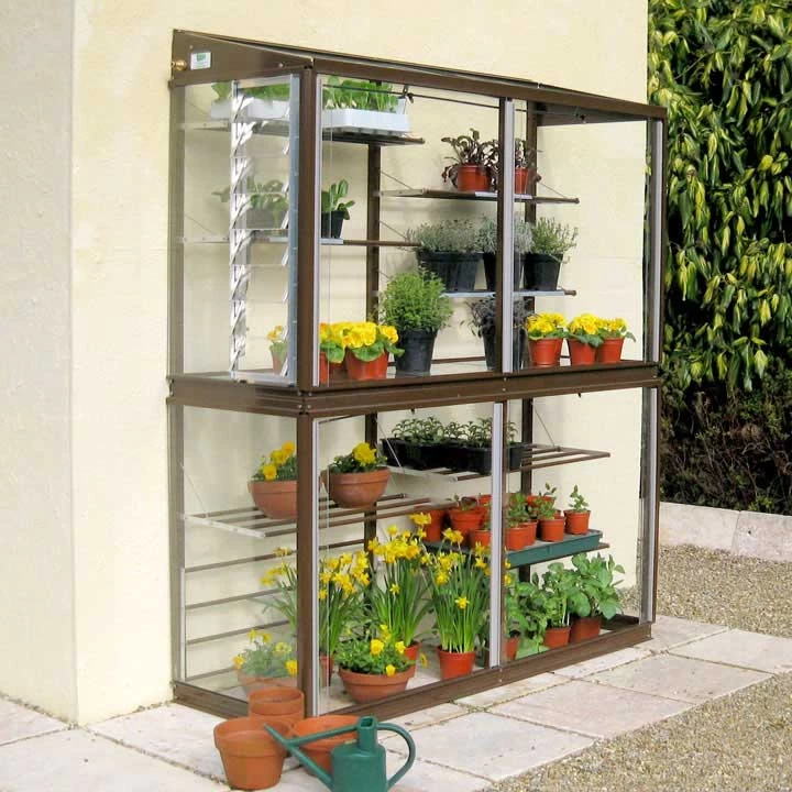 1.51m (5′) long with 4mm toughened safety glass, 2 tier watering system, 6 seed tray shelves and middle staging. Designed to fit against a wall or fence (no glass back). Wall and ground fixings included. Aluminium structure with 25 year framework guarantee. Length: 1.51m (5′). Height: 1.76m (5’10”). Depth: 0.53m (1’9″). Shown with mist watering. Optional louvre vent available separately. Colour coating Chestnut Brown. Delivery to mainland England, Wales and southern Scotland only.
