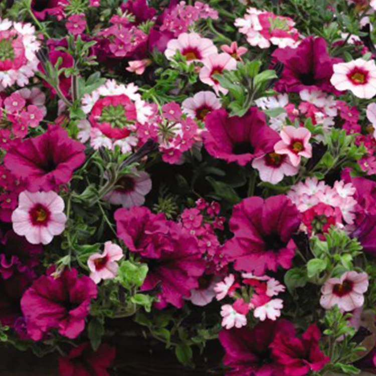 The Eton Mess container mix burst with vibrant colours of pink and white. They are fairly colour coordinated, so they will quickly mingle together right from the start to give you beautifully balanced and colourful displays. Just 4 plants will turn a 35cm (14″) basket into a huge ball of colour that brings any patio or garden back to life.