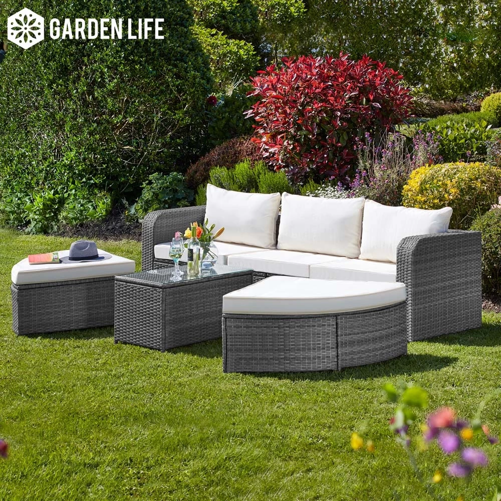 The set can be used as a day bed or can be pulled apart creating a seating area with a glass-topped coffee table, a three-seater sofa and two quarter-circle seats. Made from rattan-effect polyethylene for long-lasting durability, the Firenze Rattan Day Bed is a superb, contemporary garden seating set for a large patio or decking space.