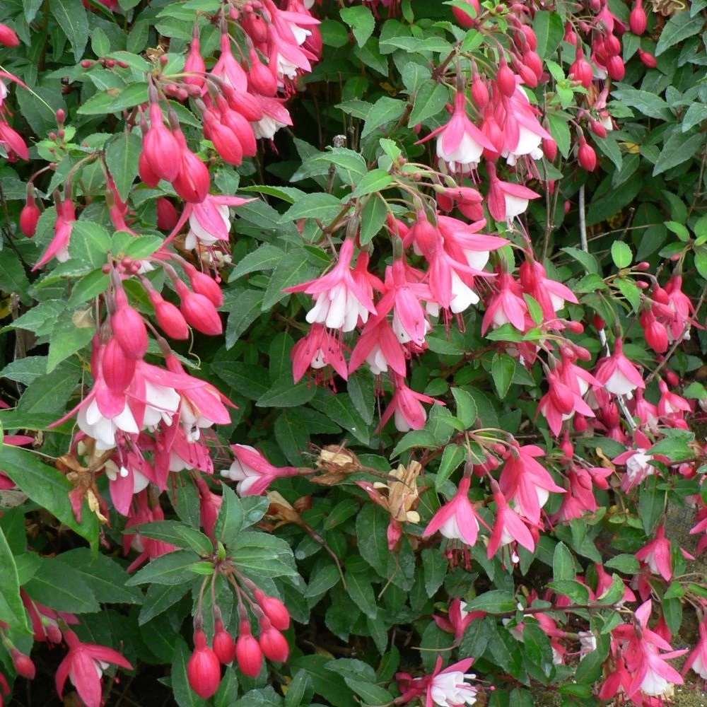 A neat, compact and hardy Fuchsia Lady Thumb flowers are pink and white, produced in masses from June through to September.