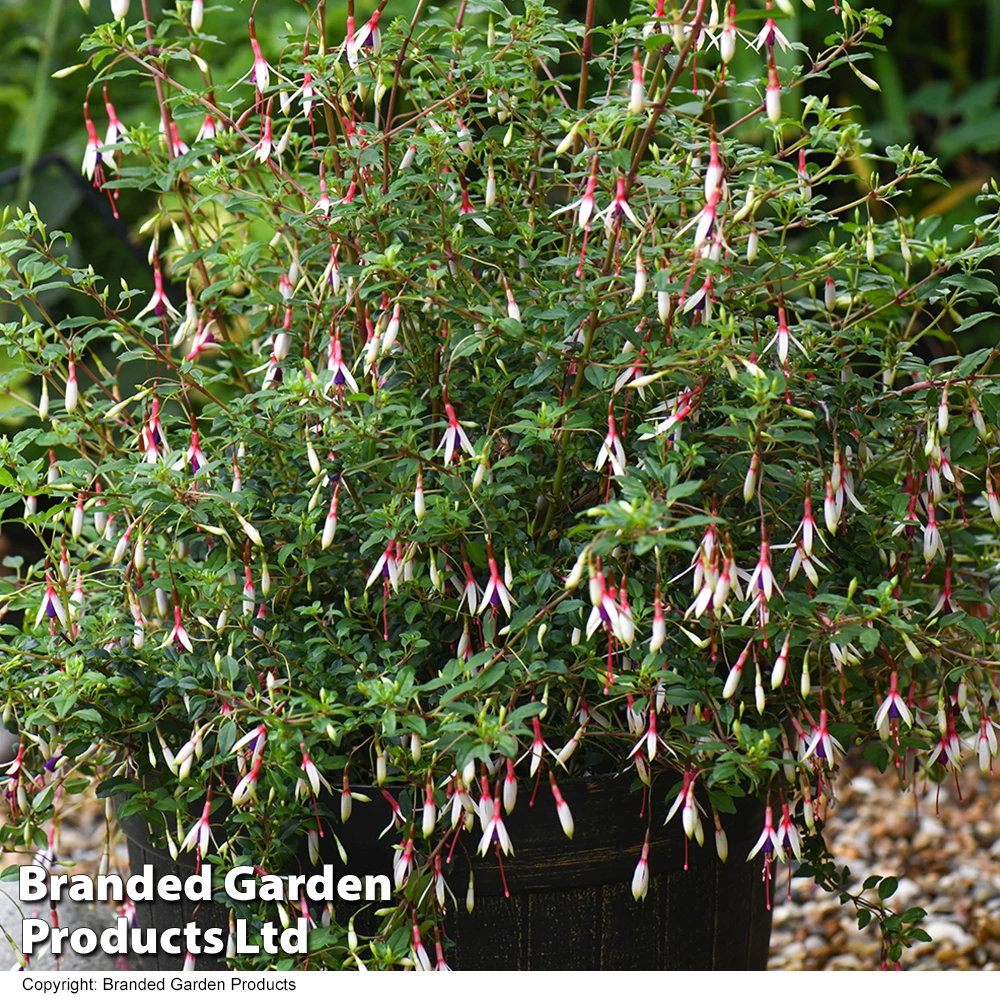 A very distinctive hardy fuchsia that boasts unusual, tri-coloured flowers. Grow Fuchsias on in warm, frost-free conditions. Pinch out the growing tips while fuchsia plants are still small to promote bushier growth and more flowers. When plants are well grown and all risk of frost has passed, gradually acclimatise them to outdoor conditions over a 7 to 10 day period, before planting them in their final positions in patio containers and sunny or semi shaded borders.