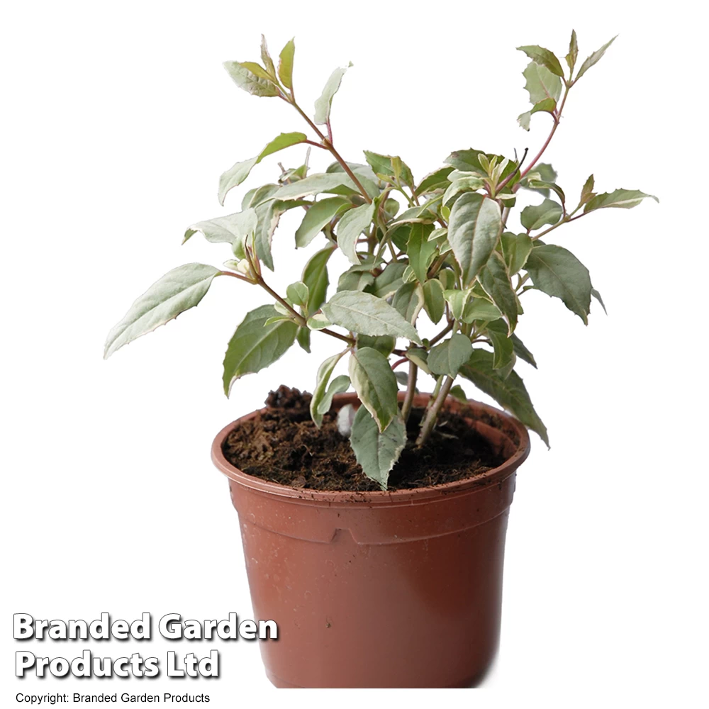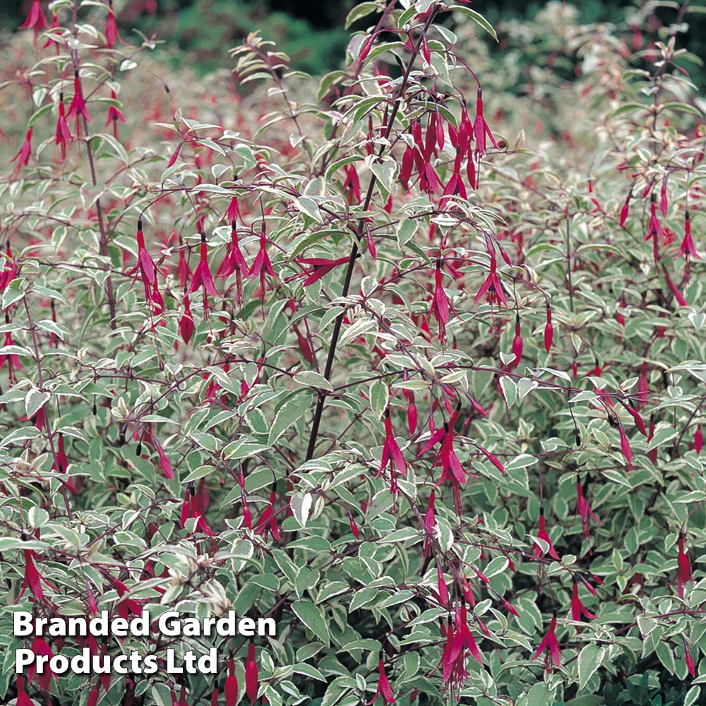 An RHS award-winning Fuchsia that deserves a place in every garden. This hardy, deciduous fuchsia is a novel twist on the popular Fuchsia magellanica, offering a winning combination of both beautiful flowers and foliage that provides a long season of interest. The light grey-green foliage is adorned with creamy edges and flushed pink when young. Fuchsia magellanica ‘Versicolor’ boasts a seemingly endless flowering season. From May to October, arching stems bear an abundance of slender, pendant blooms with cherry red sepals and purple petals.