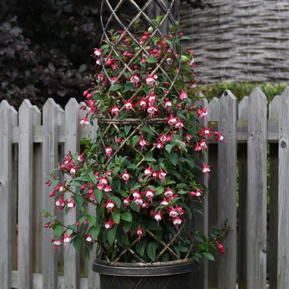 Fuchsia ‘Skyrocket’ possesses long stems that can be grown in a patio pot and tied to a support frame creating the main point.
