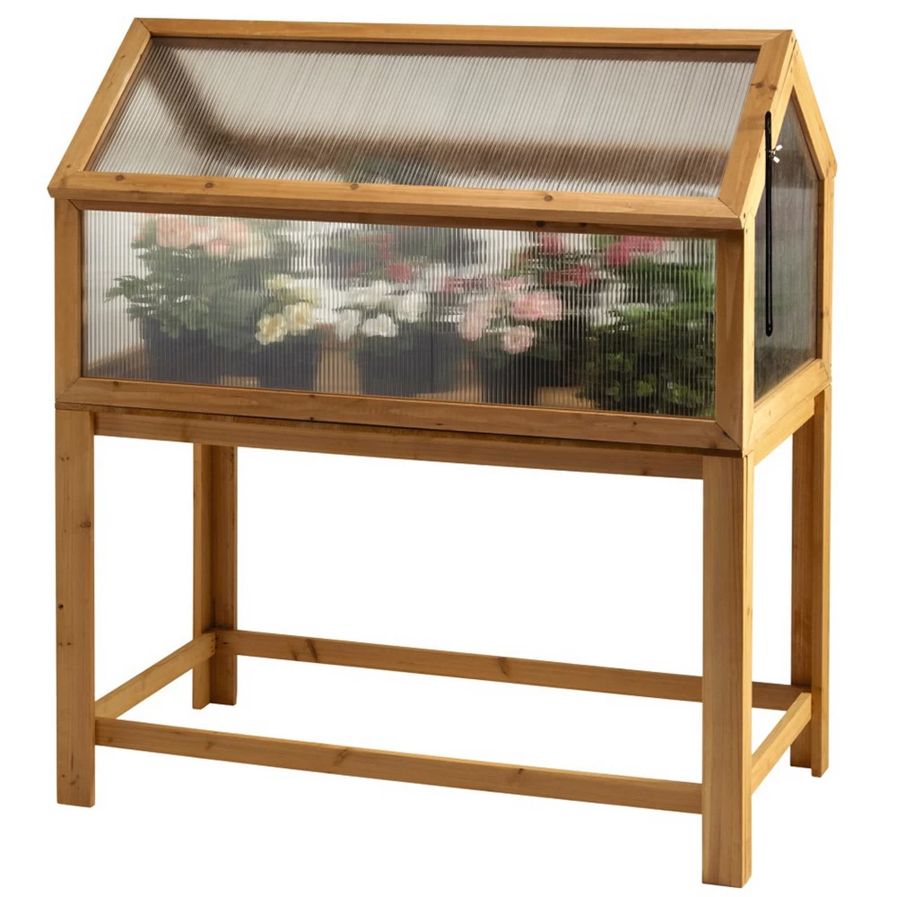 The cold frame is constructed using strong and durable fir wood with polycarbonate panels. It features a hinged lid and raised legs to make accessing your plants hassle-free. This raised cold frame will make a great addition to any garden.