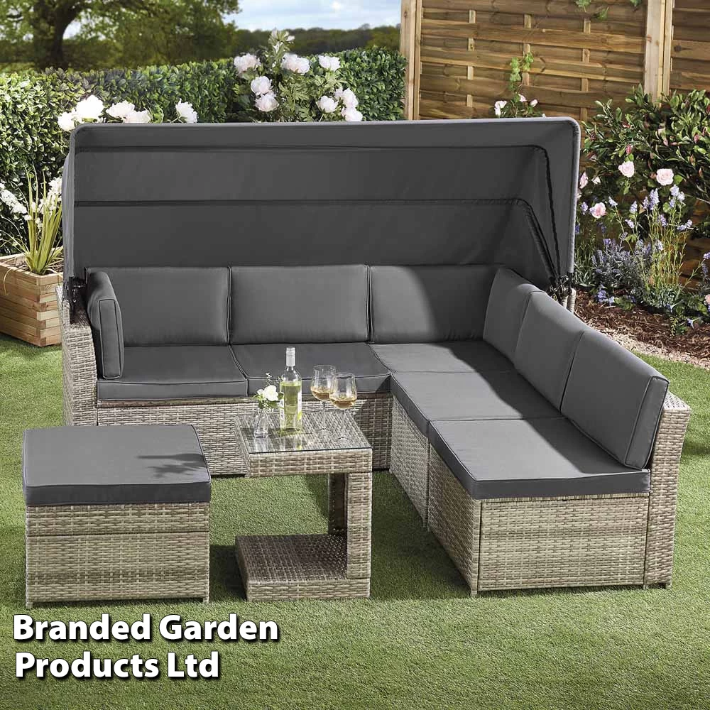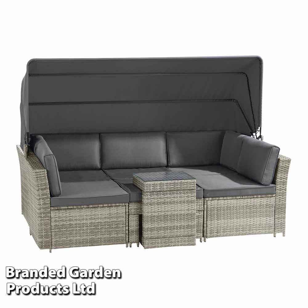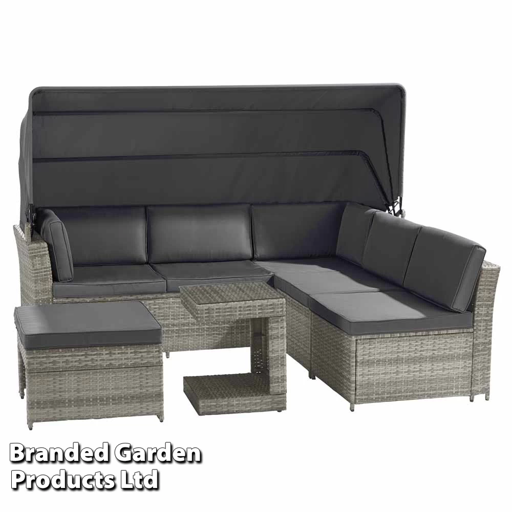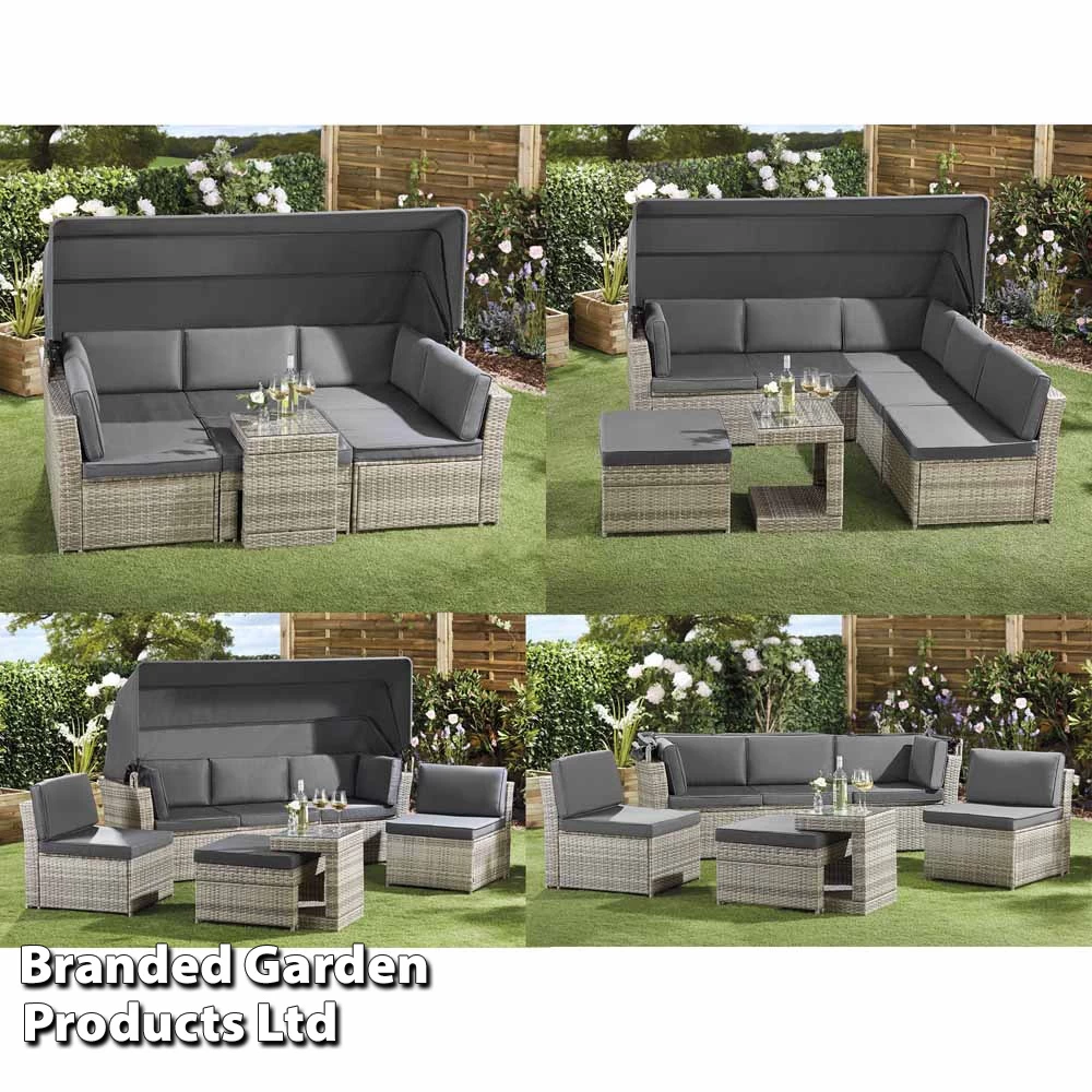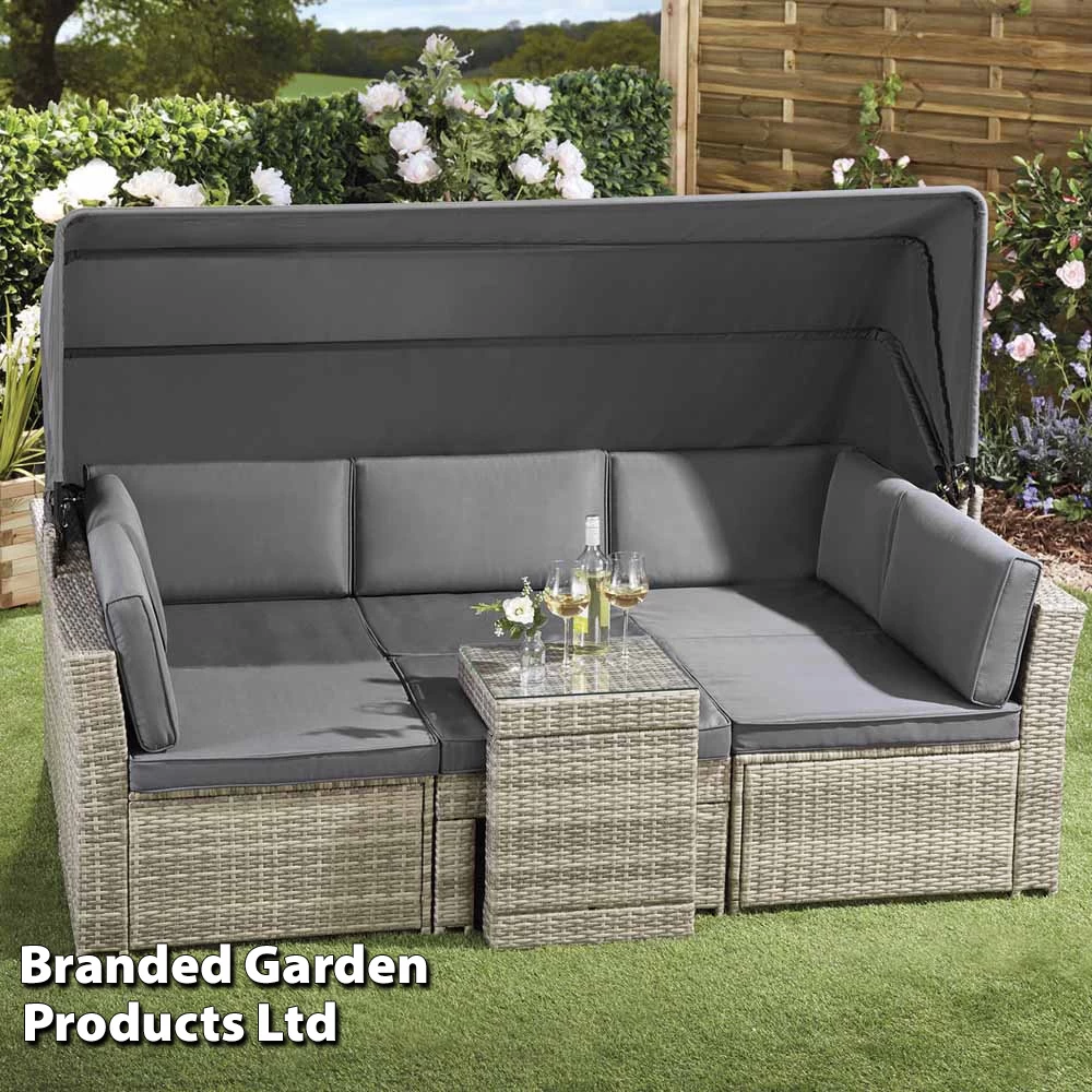 The set separates into five pieces, one large sofa, two chairs, a stool and a table, the sofa also features a retractable canopy to provide shade on hot days. You can arrange the furniture in a U shape, an L shape, individually or however you wish. The U-shape table even conveniently slots onto the stool as an excellent space saver or to use as a table when made up as a daybed. All pieces come with removable foam-filled cushions with polyester covers.