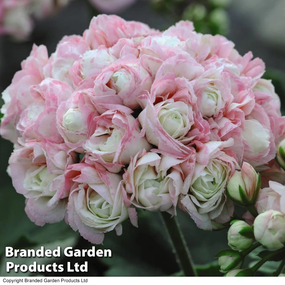 Beautiful rosebud flowers in shades of white and pink. The name says it all – clusters of rose-like blooms in apple blossom shades of delicate pink and white. This really is a luxuriant geranium deserving a prime spot in borders, containers and baskets so it can be admired by all! Strong garden performance will take them through to the first hard frost of autumn, but rosebud geraniums are fabulous for flower arranging, too. The unusual florets make a striking addition to any vase arrangement. Captivating rosebud blooms open to reveal large, bicoloured clusters of fully double, pink and white flowers. This delightful zonal geranium has retained its popularity since the Victorian age and remains admired and sought after today. The long flowering period and drought tolerance of Geranium ‘Appleblossom’ make it ideal for creating an enchanting display in borders and patio containers that will last well into autumn. Pot up pelargonium plants and grow them on in warm frost-free conditions. When all risk of frost has passed, gradually acclimatise geraniums to outdoor conditions over a period of 7 to 10 days before transplanting them into their final positions in containers, beds and borders. Plant geraniums in a sunny or semi-shaded position, in any light, non-acidic, well drained soil. Pinch out the growing tip of each stem to encourage branching and form a bushier plant which will produce more flowers later on.