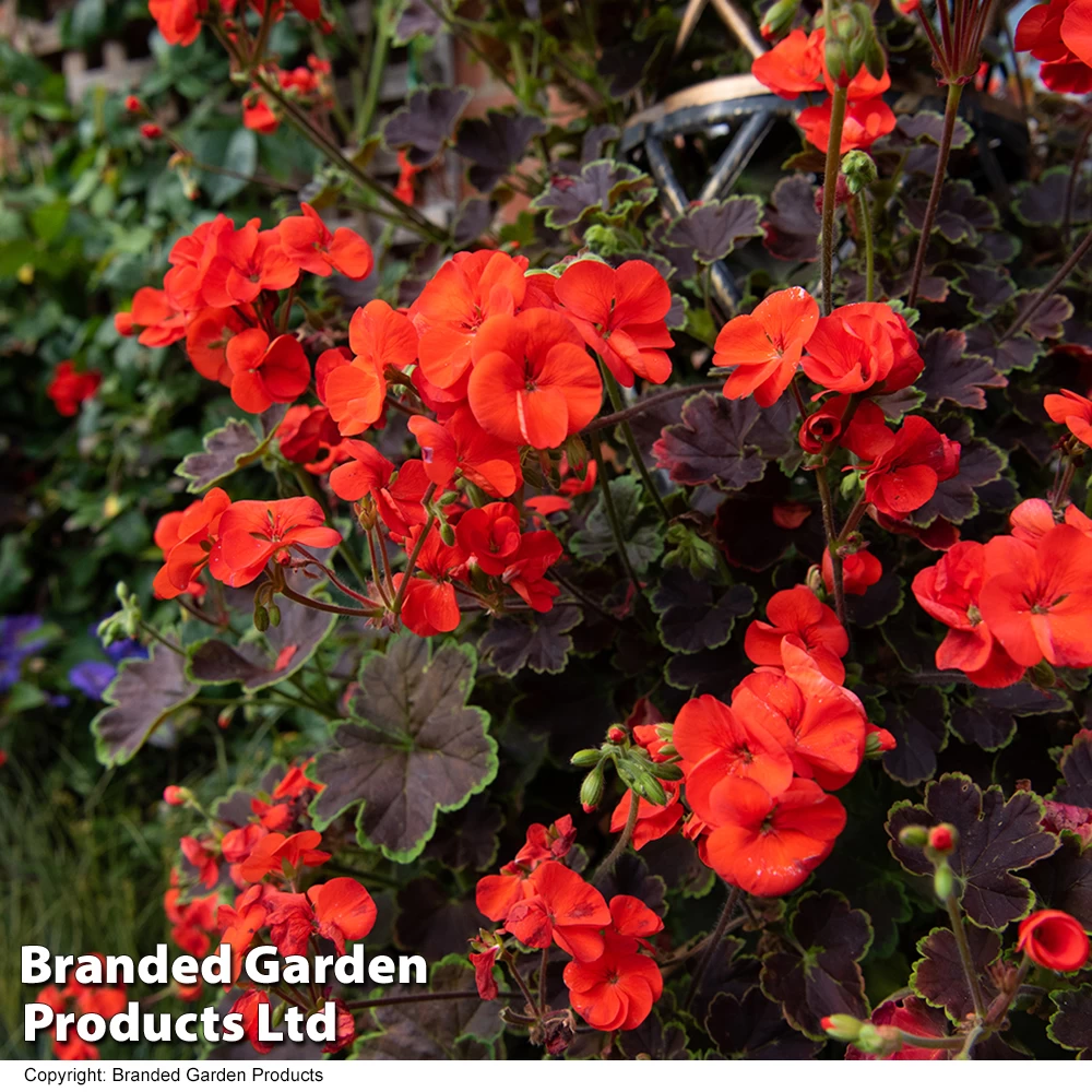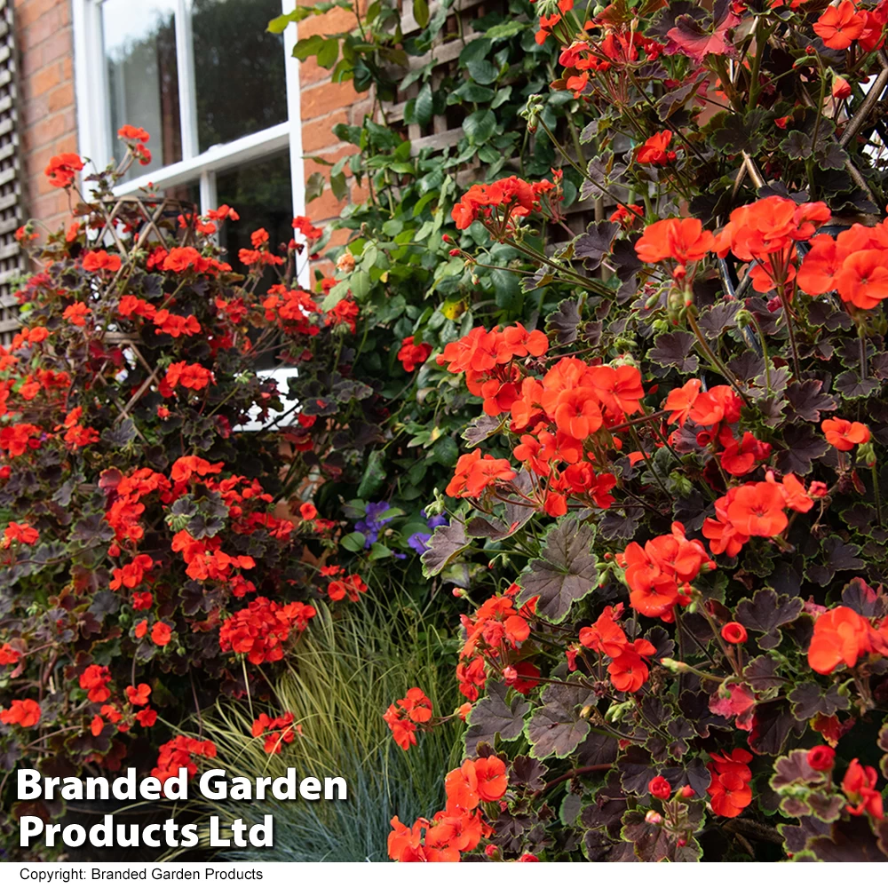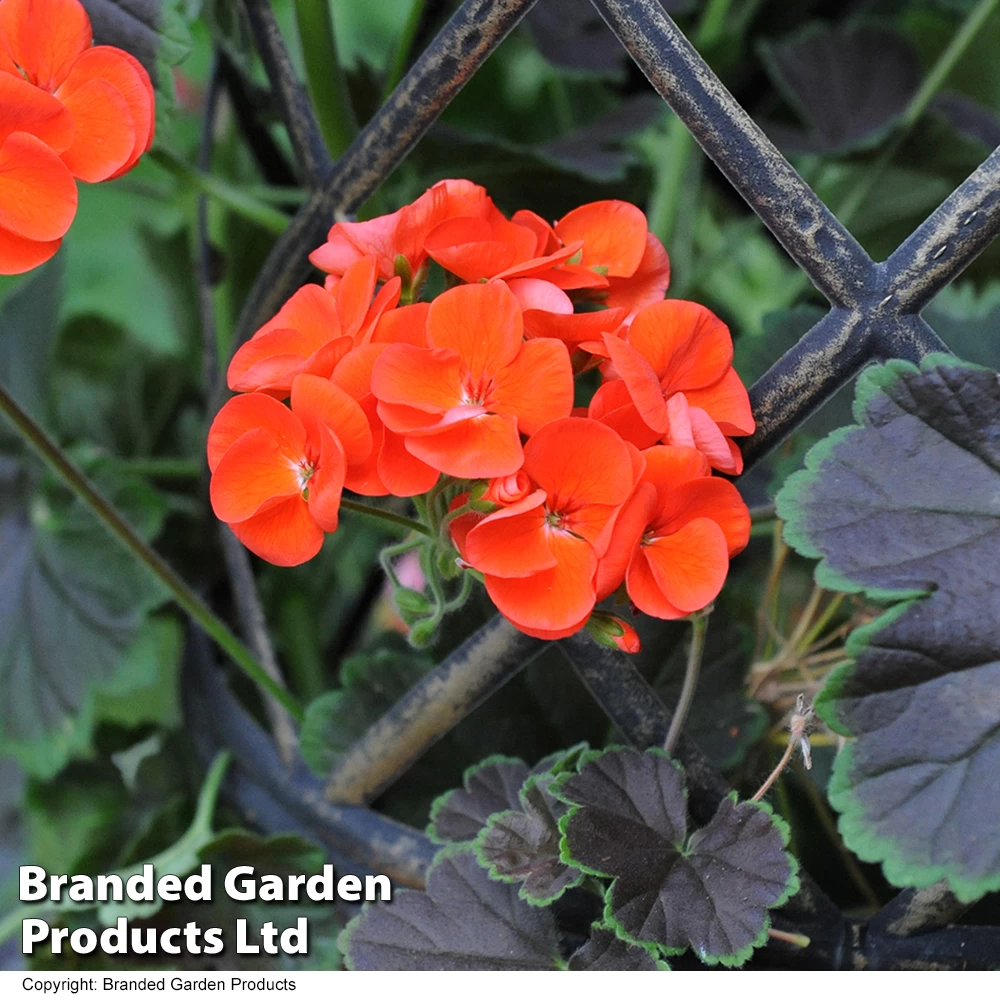 Geranium ‘Tall Dark & Handsome Orange’ is a striking pelargonium with intense orange flowers which give bright pops of colour against complementary dark foliage with a brighter green margin. Pot up pelargonium plants and grow them on in warm frost-free conditions. When all risk of frost has passed, gradually acclimatise geraniums to outdoor conditions over a period of 7 to 10 days and move them into their final positions in patio containers and borders. Plant geraniums in a sunny or semi-shaded position, in any light, well drained soil. Provide a suitable support such as an obelisk or climbing frame to train the stems onto as they grow. Pinch out the growing tip of each stem to encourage branching and form a bushier plant which will produce more flowers later on.