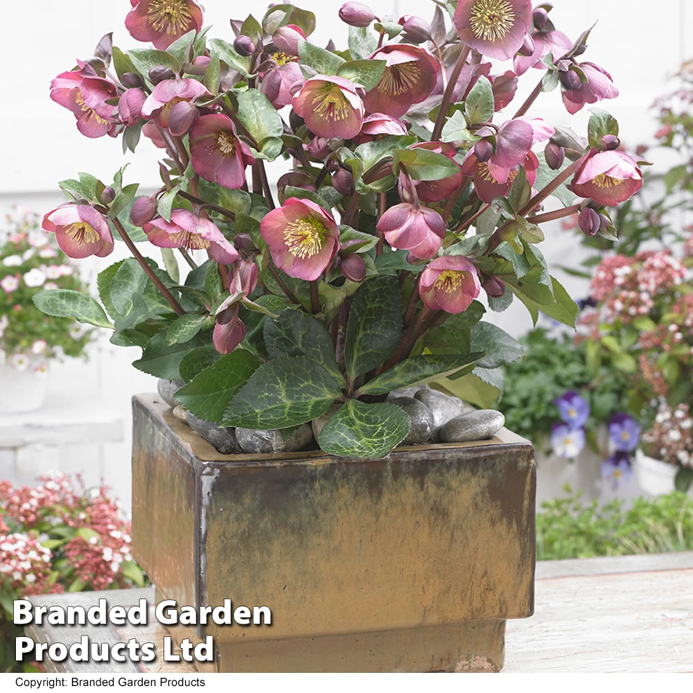The Frostkiss series of hellebores are distinguished by their gorgeous, marbled foliage which almost rivals the blooms in beauty and gives these late winter flowerers all year-round interest and appeal. The leathery, deep green leaves boast fine cream marbling which is flushed with lovely pink tones in spring. These cultivars are renowned for their prolific flowering and large, nodding blooms of up to 7cm across which come in a range of exquisite colours all highlighted by the central boss of yellow stamens. These hellebores make a welcome addition to woodland gardens and shaded borders interplanted with other early spring flowerers and bulbs where they will provide a valuable source of nectar for early emerging insects. They also make charming patio plants for winter containers. Height and Spread: 60cm (24”).