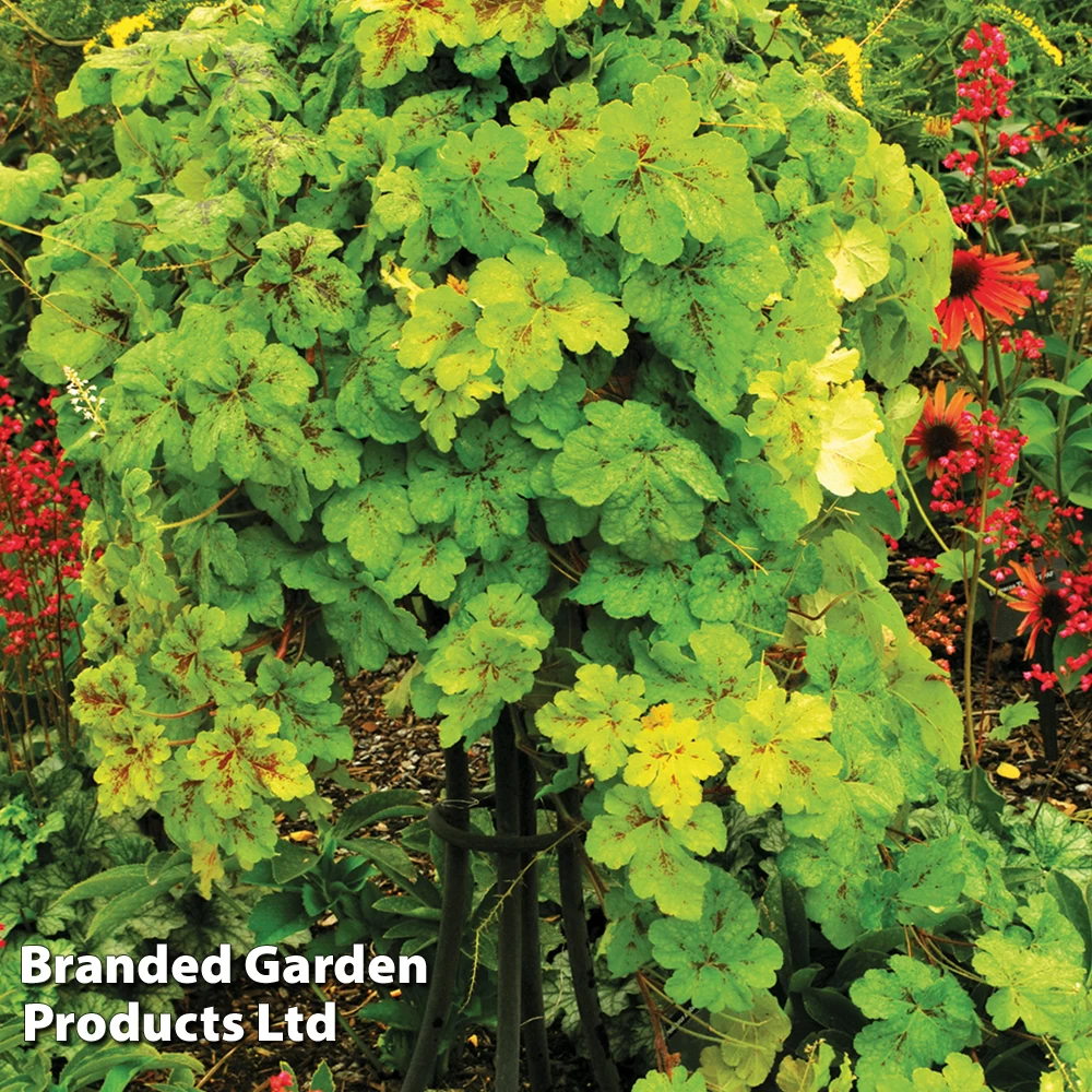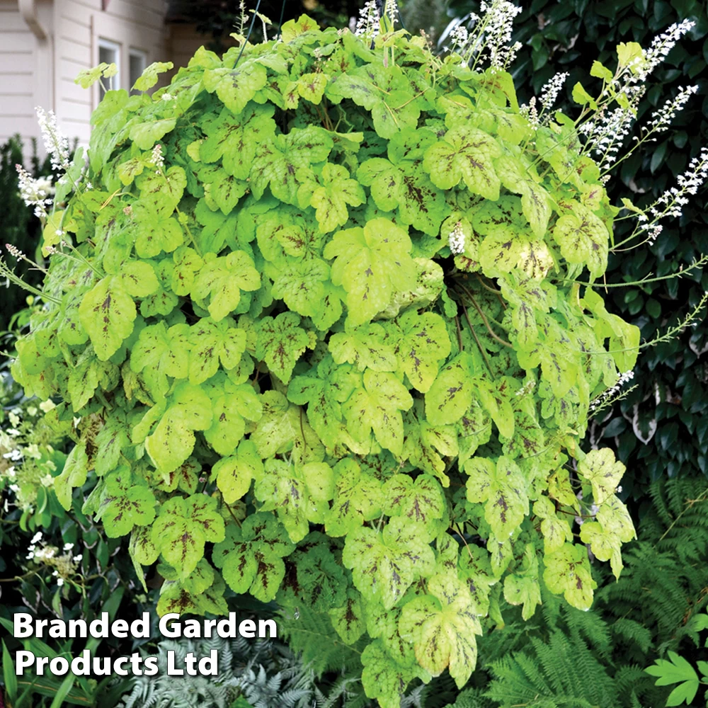 Heucherella are a cross between Heuchera and Tiarella, creating hardy, reliable, evergreen perennials with a gently trailing habit. The striking lime green leaves of Heucherella ‘Trailing Yellowstone Falls’ are patterned with crimson markings that make a vibrant display. Throughout summer, a froth of dainty white flowers rise above the foliage on slender stems. The trailing stems make this a superb choice for cascading from patio pots, window boxes and hanging baskets, or spilling over low walls. Height: 25cm (10″). Spread: 60cm (24″). Heucherella are a cross between Heuchera and Tiarella, creating hardy, reliable, evergreen perennials with a gently trailing habit. The striking lime green leaves of Heucherella ‘Trailing Yellowstone Falls’ are patterned with crimson markings that make a vibrant display. Pot up Heucherella plants and grow them on in frost-free conditions until large enough to plant outside. When they are well grown and all risk of frost has passed, acclimatise them to outdoor conditions over 7 to 10 days before planting them outdoors. Grow Heucherella as groundcover plants in borders, or as trailing plants in containers, hanging baskets and window boxes. Heucherella plants dislike soils which are particularly dry or have a tendency to water-logging. Plant them in moist, fertile, well drained soil, adding plenty of compost or well rotted manure to amend heavy clay or sandy soils. Choose a position in full sun or semi shade.
