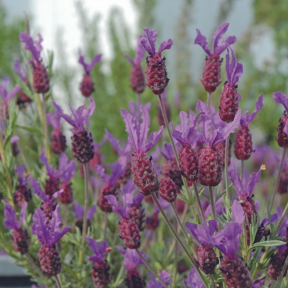 Delightfully compact, Lavender ‘Antibes’ bears masses of mauve purple flower spikes topped with pink bracts that are characteristic of French Lavenders. Its upright, non-branching stems are covered with silver-green aromatic foliage that remains evergreen. Lavender ‘Antibes’ is a useful shrub for many situations. Perfect for wildlife areas, sunny borders, containers, sensory gardens and cut flower borders. Height and spread: 30cm (12″).