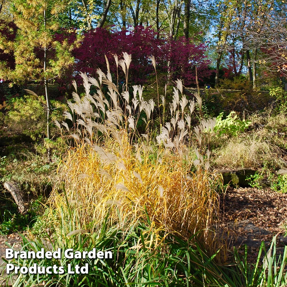 A perennial, deciduous grass that produces a dense clump of narrow, green leaves from its strong root growth. Miscanthus sinensis ‘Graziella’ is ideal as a specimen plant or planted as part of an ornamental grasses border. Given its impressive height, it also makes a good windbreak. Grow Miscanthus grass in fertile, moist, well drained soil in full sun. Miscanthus Grass may resent soils that sit wet in winter. Prior to planting, improve drainage on particularly heavy soils by incorporating plenty of well rotted compost and grit.