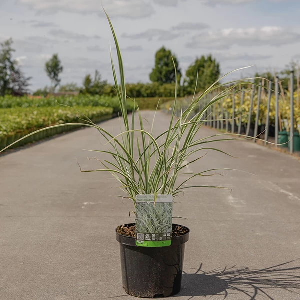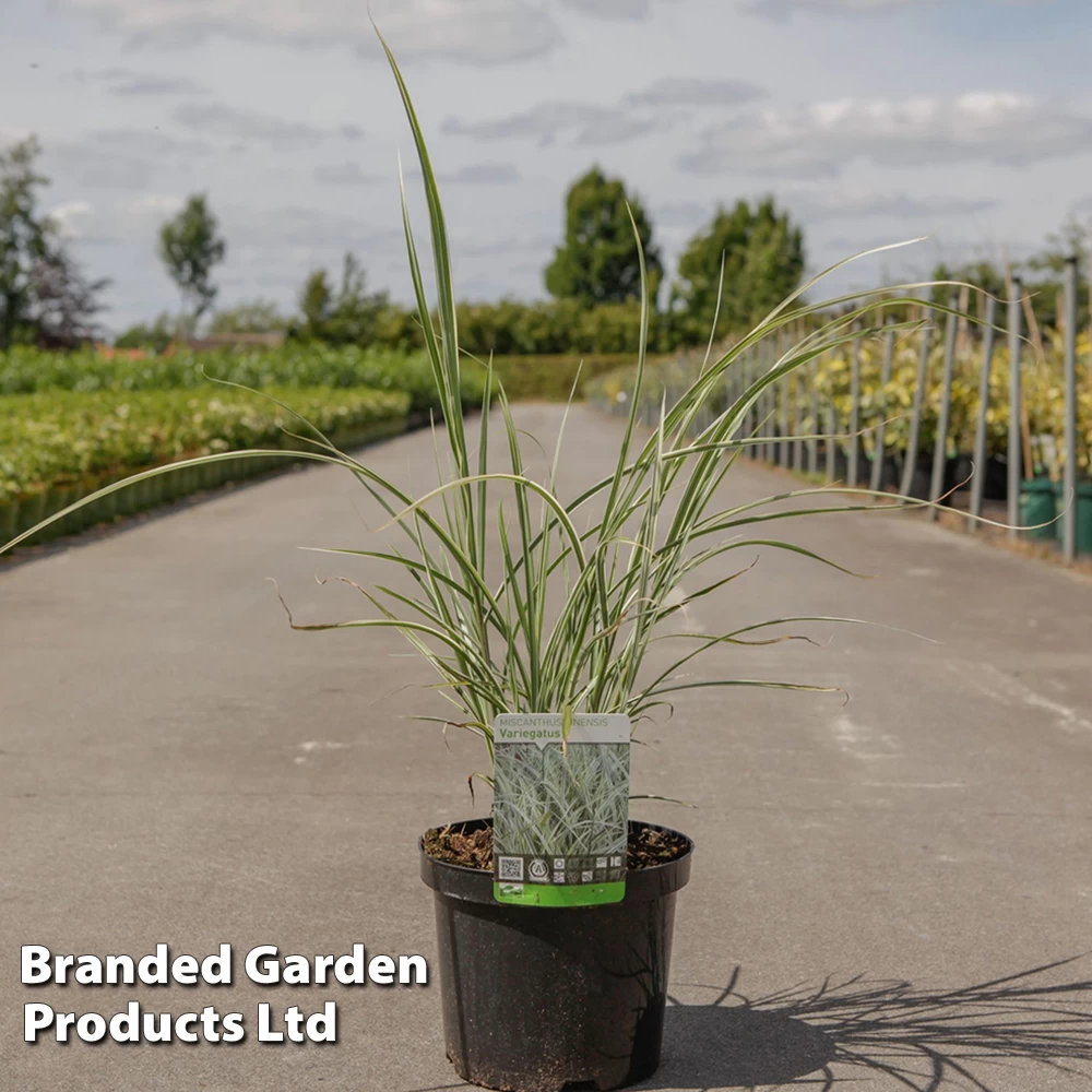 A crowd-pleaser through all the seasons, Miscanthus sinensis ‘Variegatus’ is a deciduous grass that delivers elegant form and texture, variegated foliage, summer flowers and autumn colour that lasts well into the winter. Grow Miscanthus grass in fertile, moist, well drained soil in full sun. Miscanthus Grass may resent soils that sit wet in winter. Prior to planting, improve drainage on particularly heavy soils by incorporating plenty of well rotted compost and grit.