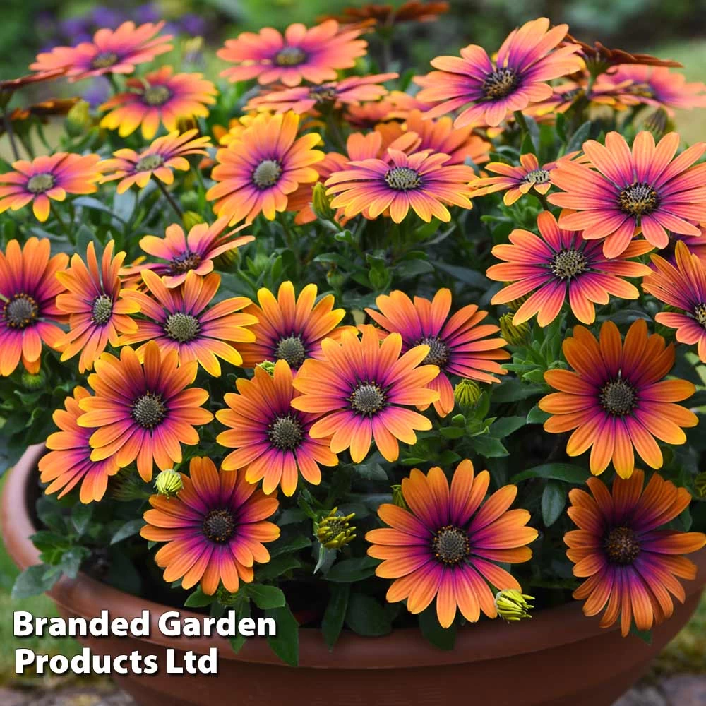 The extraordinary colour combo of osteospermum Purple Sun make it a stand-out variation of this African Daisy. The purples and yellows make a dazzling display come summer, when the full sun allows them to open up to their widest potential, greeting you as you enter your garden. Neat, compact and well-rounded, this is a perfect plant for containers, at the front of borders or even in rockeries! Like most osteospermum, this plant is suited to well-drained soil – avoid cold, wet soil to get the best out of it. Flowers June-August. Height 40-50cm (16-20″).