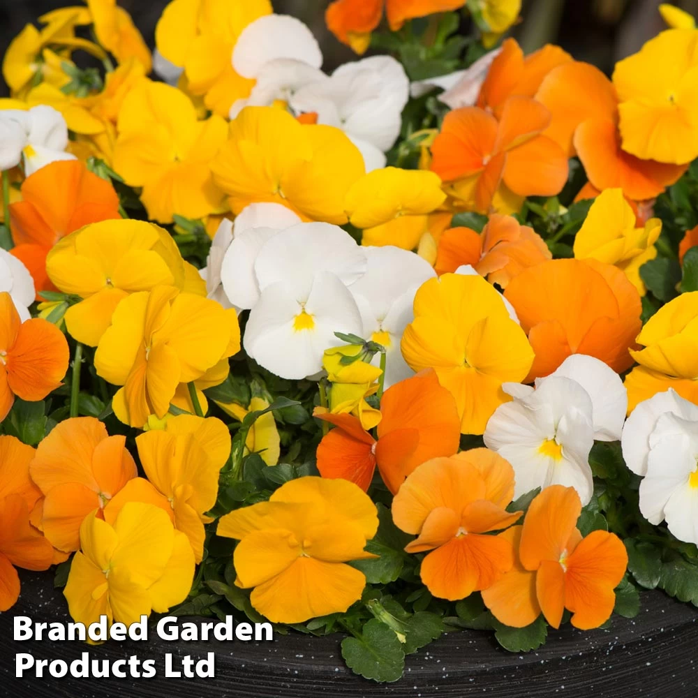 Fill your beds, baskets, pots and window boxes with radiant colour with Pansy Matrix™ ‘Daffodil Mixed’. Uniform, mounded plants produce masses of large flowers in sunny shades of yellow, orange, lemon and white from autumn right through to spring, standing up to the coldest, darkest, wettest winters. With a well-branched habit and excellent hardiness, Matrix™ Series pansies boast the most flowers per plant of any large-flowered pansy! Height: 20cm (8in). Spread: 23cm (9in).