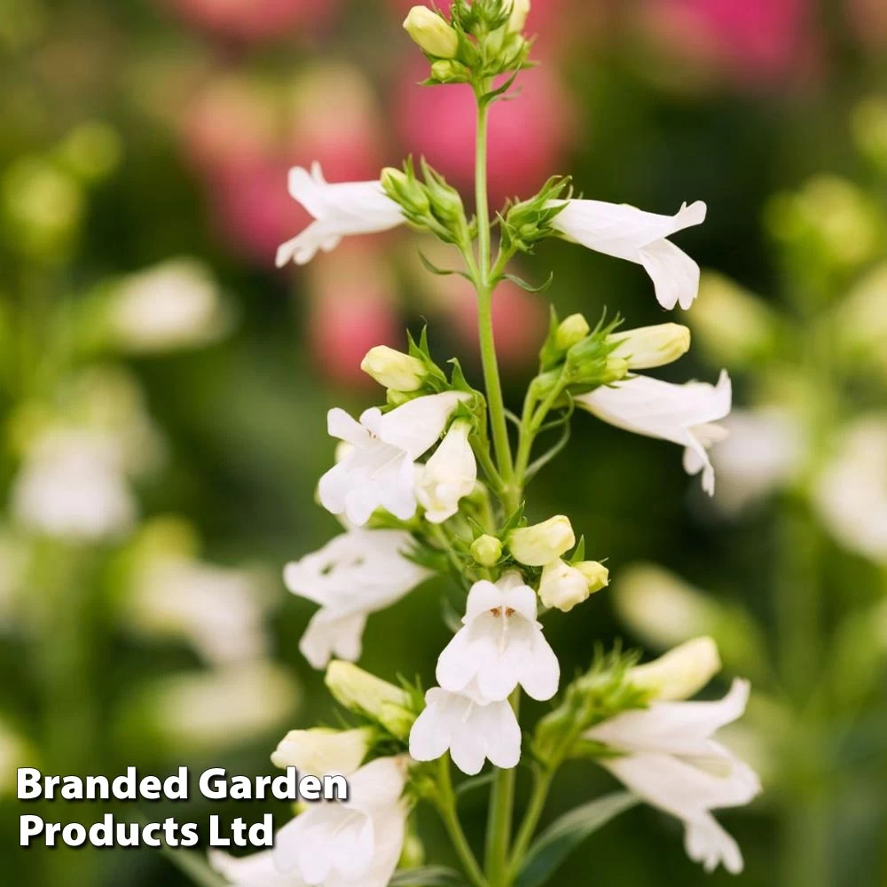 Ivory white bells crowd the upright stems of Penstemon ‘Pensham Wedding Day’ above a neat clump of narrow semi-evergreen foliage. Brimming with understated elegance, this hardy perennial blends effortlessly into herbaceous borders. Like all of the Pensham Penstemons, this cultivar has been bred to withstand lower temperatures and inclement weather, making it perfect for UK summers. It has staying power too – flowering continuously from early summer through to October. Height: 75cm (30″). Spread: 60cm (24″). Grow penstemon in a sunny or semi shaded position on fertile, well drained soil. Penstemons can tolerate dry soils once established but dislike heavy soils that are particularly cold and wet in winter. Improve heavy soils by adding plenty of coarse grit prior to planting.