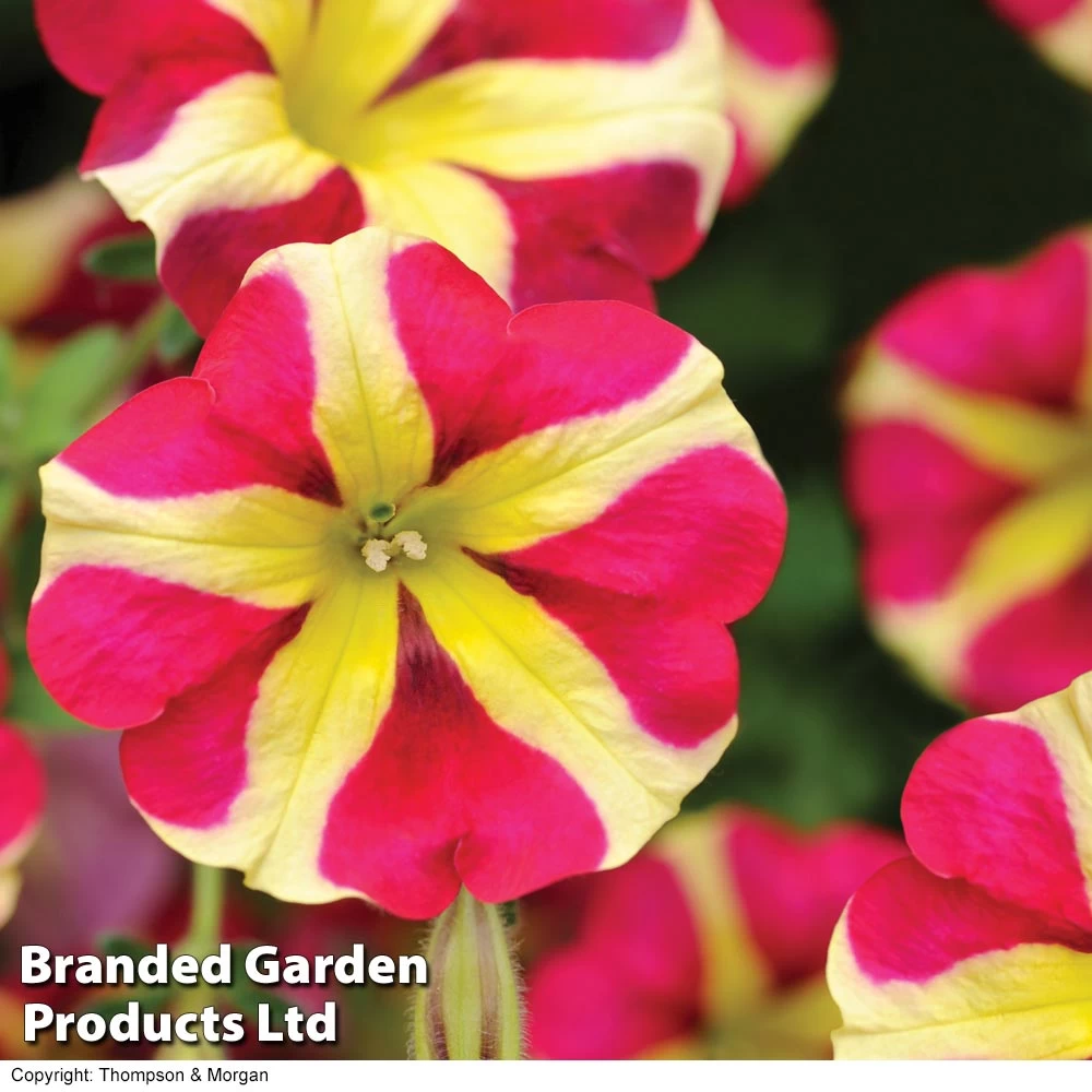 This royal duo of fantastically free-flowering petunias is sure to get your heart racing. Petunia ‘Amore™ King & Queen of Hearts’ are smothered with blooms all summer, each boasting a central star – the Queen’s in yellow and the King’s in white. Surrounding the star are five bold red love hearts. These bushy, semi-trailing petunias will literally flower their hearts out in pots, baskets and containers, keeping their regal heads aloft, even after a heavy downpour of rain. Height and spread: 30cm (12″).