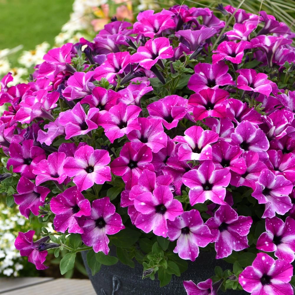 This new colour break delivers trumpet-shaped flowers with a combination or white stars and splashes against a magenta pink background. Petunia ‘Circus Sky’ has a well-branched, semi-trailing habit that will spill from containers. Pot up petunia plants and grow them on in warm frost-free conditions for transplanting later on. Pinch out the growing tip of each stem to encourage branching and form a bushier plant which will produce more flowers later on. When all risk of frost has passed, gradually acclimatise them to outdoor conditions over a period of 7 to 10 days, before transplanting them outdoors into baskets, window boxes and containers in well drained soil, in full sun.