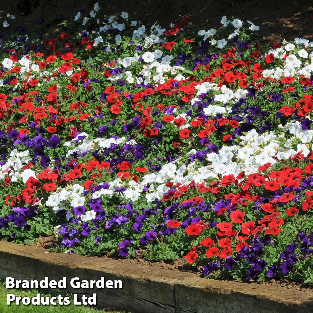 Create a spectacular – and patriotic – display for your hanging baskets, Flower Pouches™, window boxes and patio pots or even ground cover with these super-vigorous and great value petunias. Fast-growing plants bloom freely all summer long without the need for cutting back and are very tolerant of both heat and cooler conditions. Plants will be smothered with flowers and are mounded and spreading in their growing habit Pot up petunia plants and grow them on in warm frost-free conditions for transplanting later on. Alternatively, plant plugs directly into flower pouches.Pinch out the growing tip of each stem to encourage branching and form a bushier plant which will produce more flowers later on. When all risk of frost has passed, gradually acclimatise them to outdoor conditions over a period of 7 to 10 days, before transplanting them outdoors into baskets, window boxes and containers in well drained soil, in full sun.