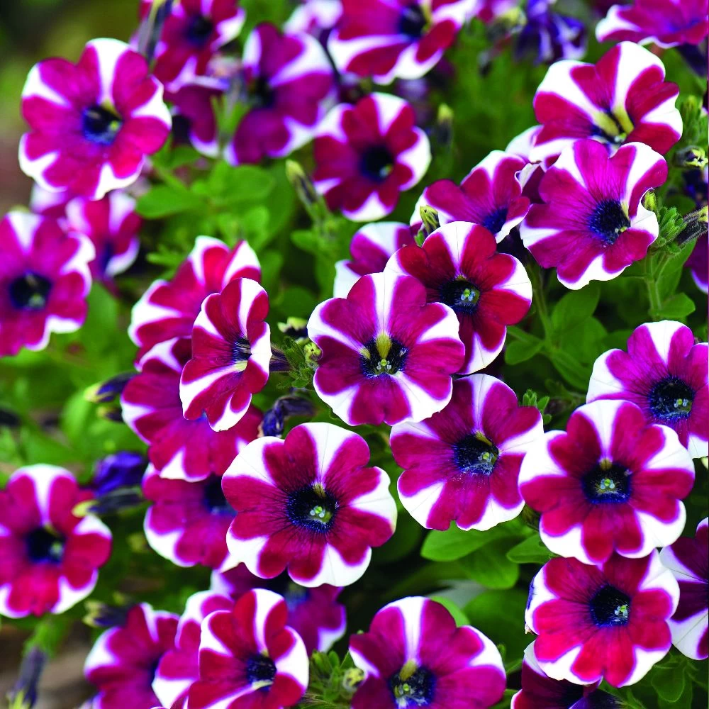 Create a truly eye-catching display of colour in your hanging baskets, pots and window boxes with this extremely floriferous petunia. Lush trailing foliage is covered with wonderful red and white flowers making a crocheted cushion of colour all summer long! This free-flowering variety is smothered with bicolour blooms throughout the summer. The trailing stems spill over the sides of baskets, window boxes and patio pots. With a vigorous growth habit and lush green foliage, Petunia ‘Pegasus Burgundy Bicolour’ forms a rounded cushion that makes a fantastic attention-grabber Pot up petunia plants and grow them on in warm frost-free conditions for transplanting later on. Alternatively, plant plugs directly into flower pouches. Pinch out the growing tip of each stem to encourage branching and form a bushier plant which will produce more flowers later on. When all risk of frost has passed, gradually acclimatise petunias to outdoor conditions over a period of 7 to 10 days, before transplanting them outdoors into baskets, window boxes and containers in well drained soil, in full sun.