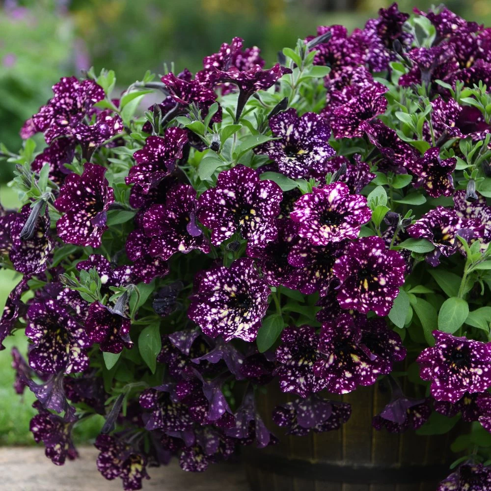 One of the best of the immensely popular spotted Petunias. The deep velvety-purple flowers with white and yellow splashes create a dramatic contrast. Vigorous, bushy plants with a prolific, free flowering habit are smothered with trumpet shaped blooms all summer. The semi-trailing habit makes it ideal for both hanging baskets and patio containers. Height and spread: 30cm (12″). Dark purple, velvety trumpet blooms are speckled with splashes of white like a starry sky. Petunia ‘Pegasus Wine Splash’ is set to take UK garden by storm with its eye-catching good looks. Pot up petunia plants and grow them on in warm frost-free conditions for transplanting later on. Pinch out the growing tip of each stem to encourage branching and form a bushier plant which will produce more flowers later on. When all risk of frost has passed, gradually acclimatise them to outdoor conditions over a period of 7 to 10 days, before transplanting them outdoors into baskets, window boxes and containers in well drained soil, in full sun.