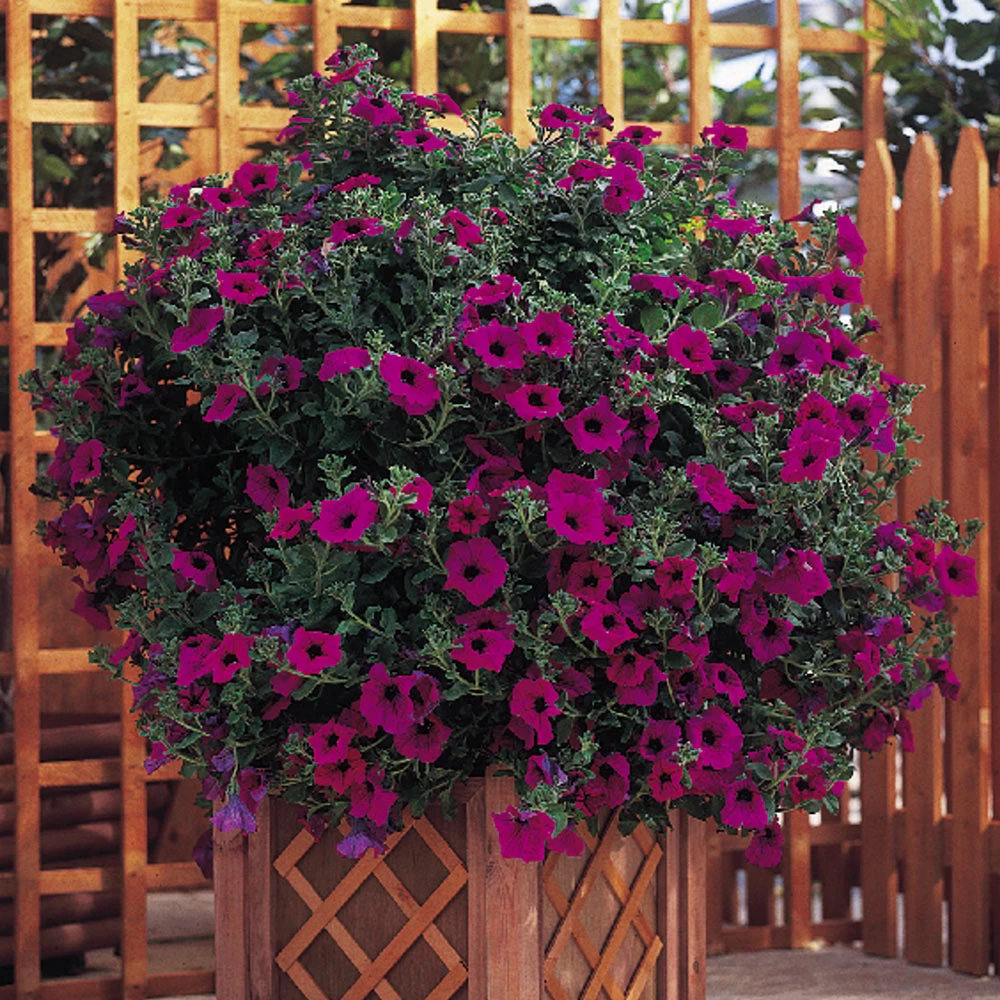 Surfinia petunias are world-renowned for their flower power, weather resistance, colour range and versatility. They’re ideal for creating a cascade of colour from hanging baskets or containers or let it tumble over walls in a wave of large-flowered, trumpet-shaped blooms. They also make superb ground cover. Trails up to 90cm (3′). Flowers June-early October. Height 80-90cm (31-35″).