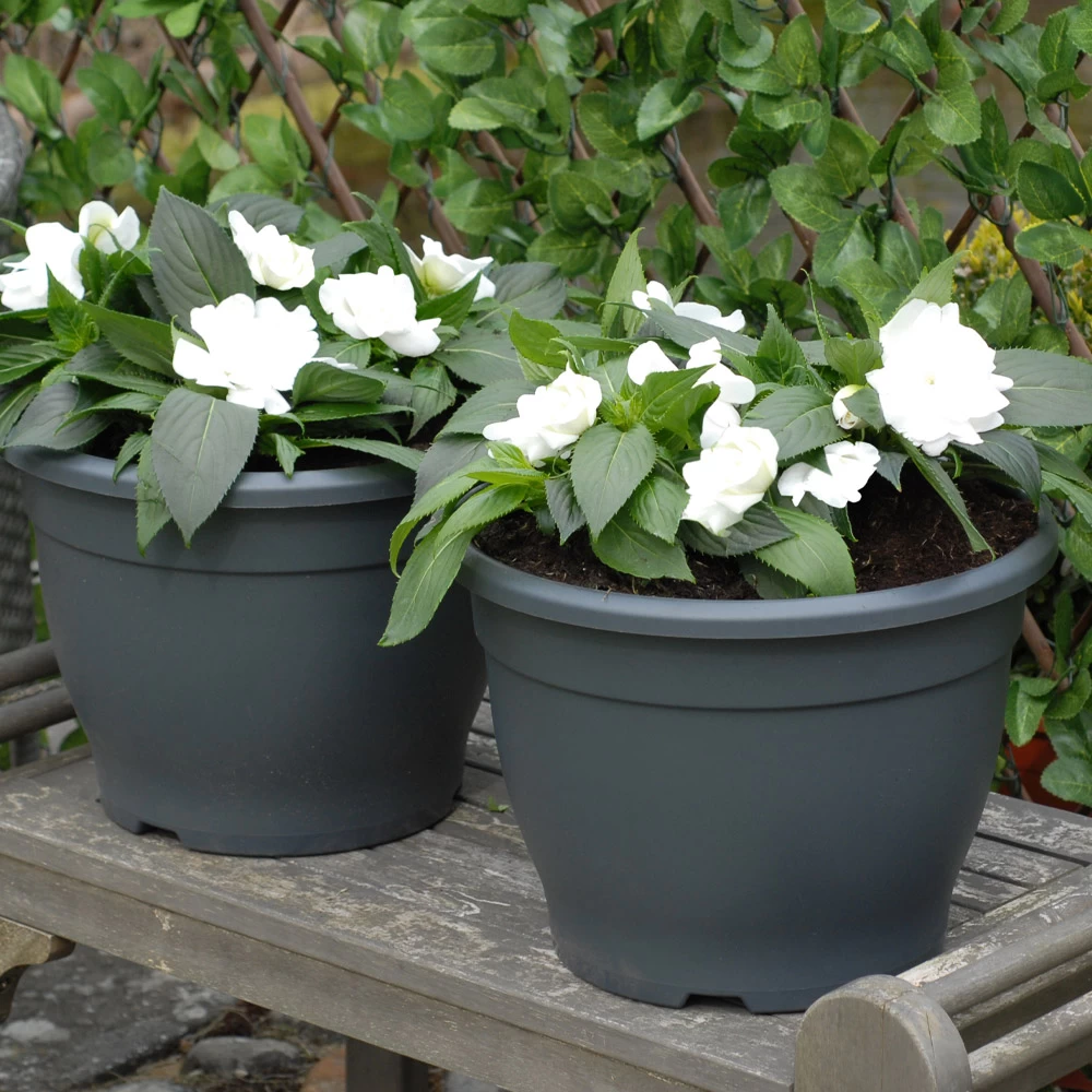 Give your plants a stylish home with the Sabina Dark Grey Patio Planter. Made from weather-proof plastic it is lightweight and durable, making it easy to move around the garden when needed. Complete with pre-drilled drainage holes. Pot diameter: 32cm/12.5in, height 23cm/9in.