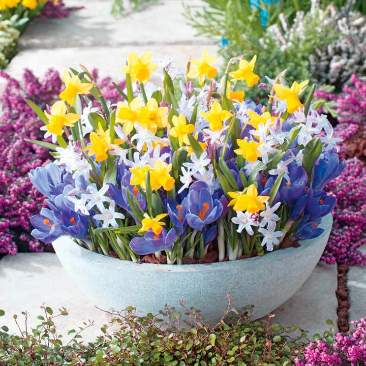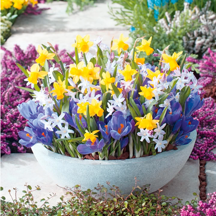A specially selected mix of miniature flowered bulbs for your favourite pots or baskets providing colour to patios and balconies. Mix contains 30 bulbs of the varieties: Crocus Blue, Chionodoxa White, Narcissus Tete a Tete. Flowers March and May. Height 10-20cm.